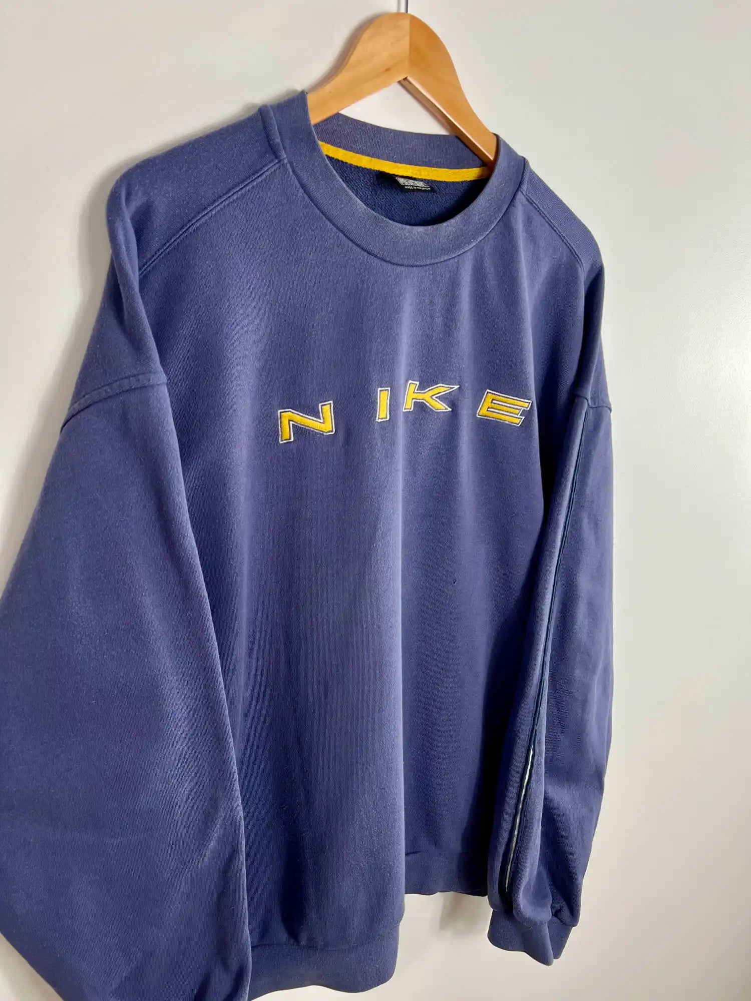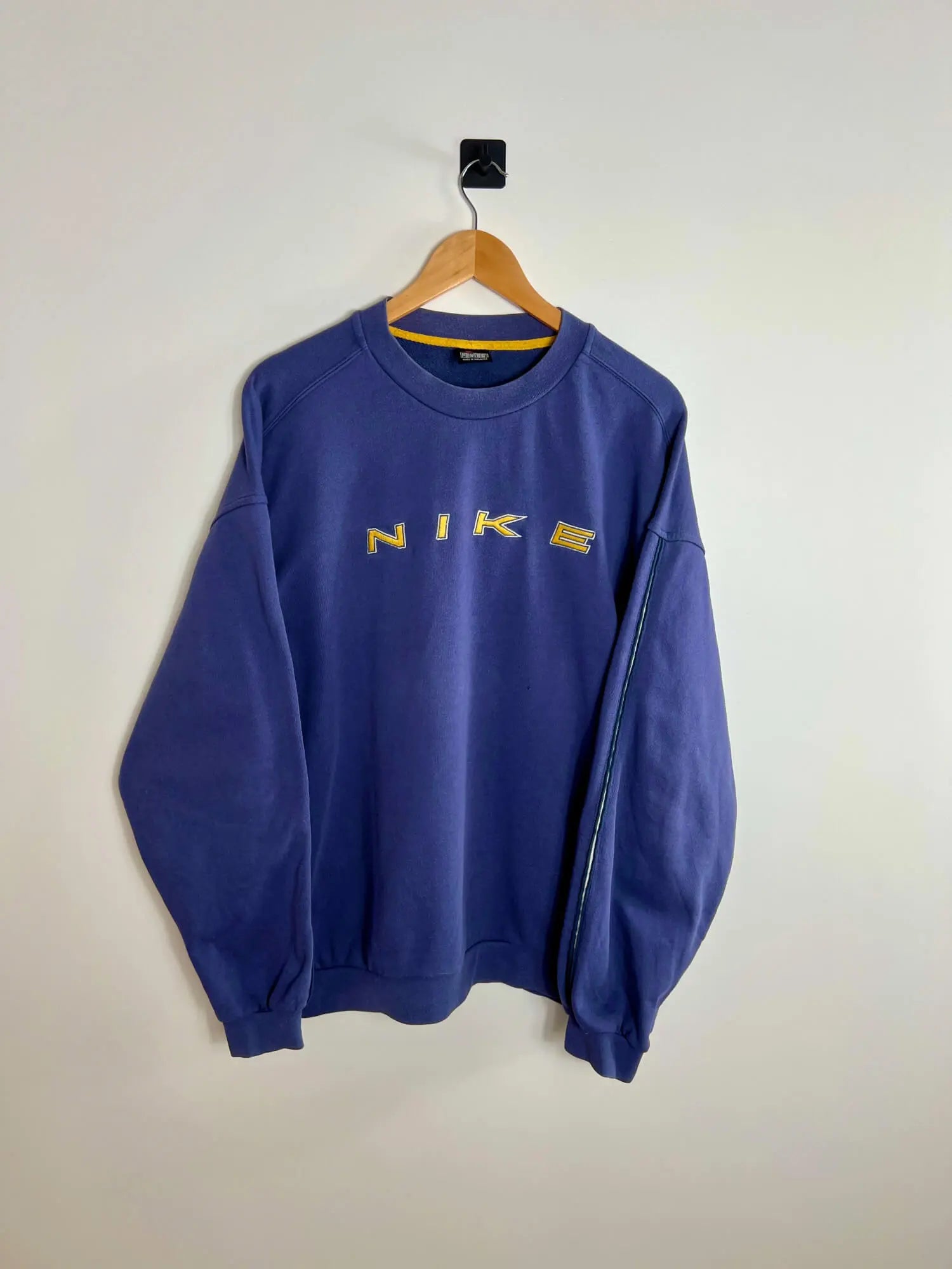 Ce Nike Vintage 90s Sweatshirt arbore le logo Nike brodé en grand sur la poitrine avec un lettrage jaune contrastant, typique du style des années 90. Une bande latérale avec un détail subtil ajoute du caractère à cette pièce, tout en restant fidèle à l’ADN sportif et urbain de Nike.