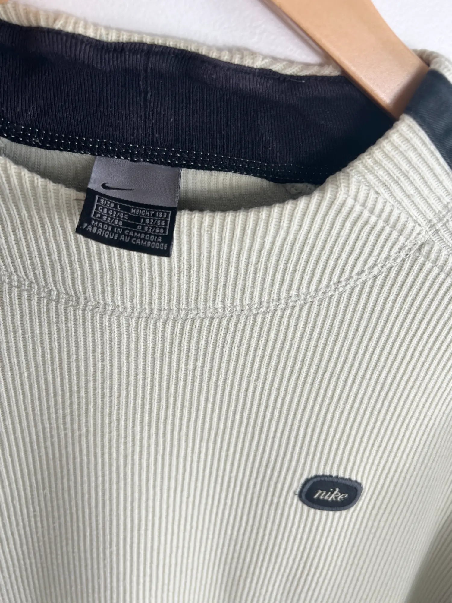 On est clairement dans un mood early 2000s chic et détendu. Le beige, c’est LA couleur qui te donne direct une allure propre, soignée, mais sans en faire trop. Et avec cette maille façon pull tricoté, t’as une texture qui change de l’ordinaire. C’est pas un simple sweat : c’est un pull vintage Nike qui a de la personnalité.