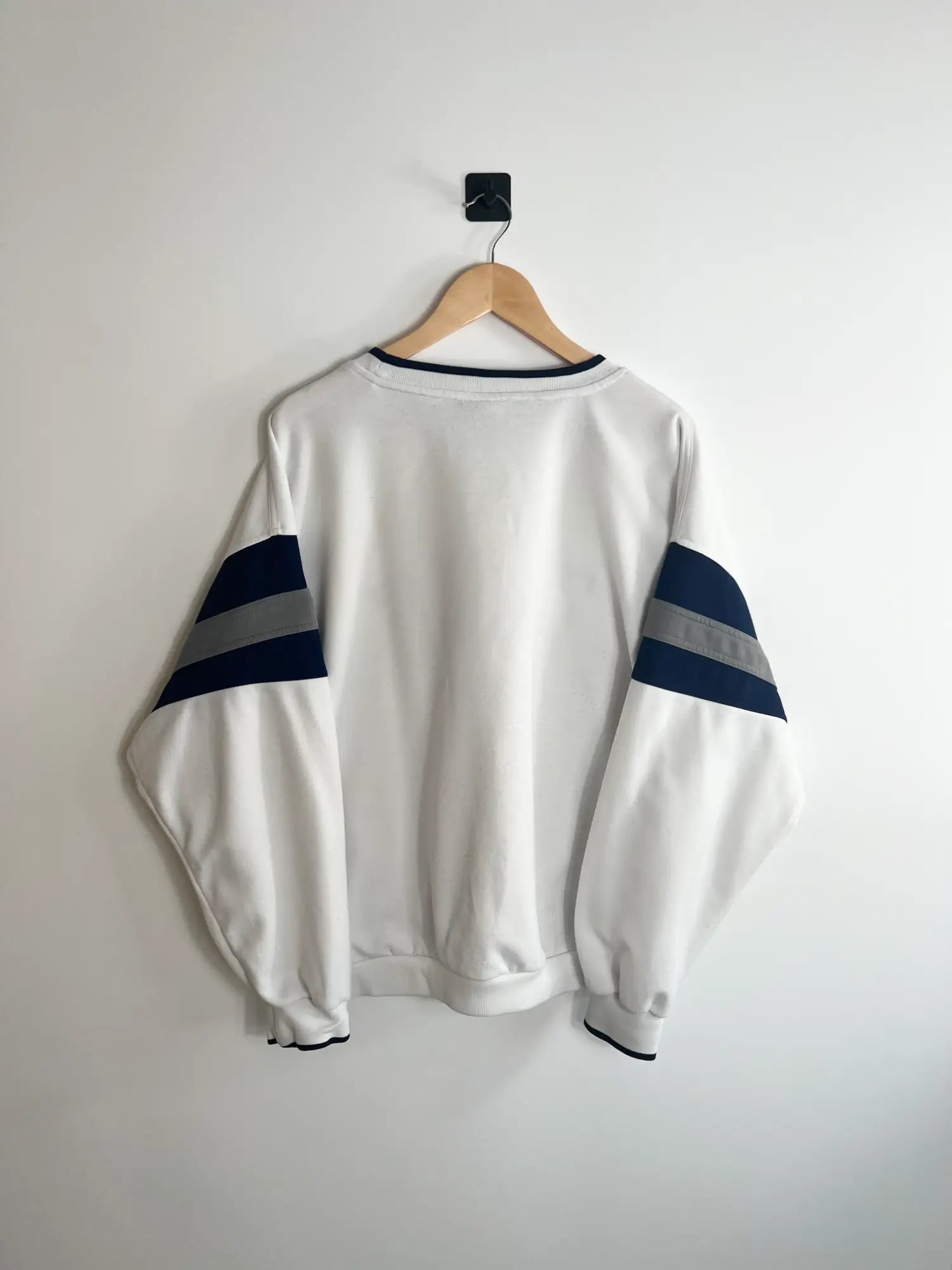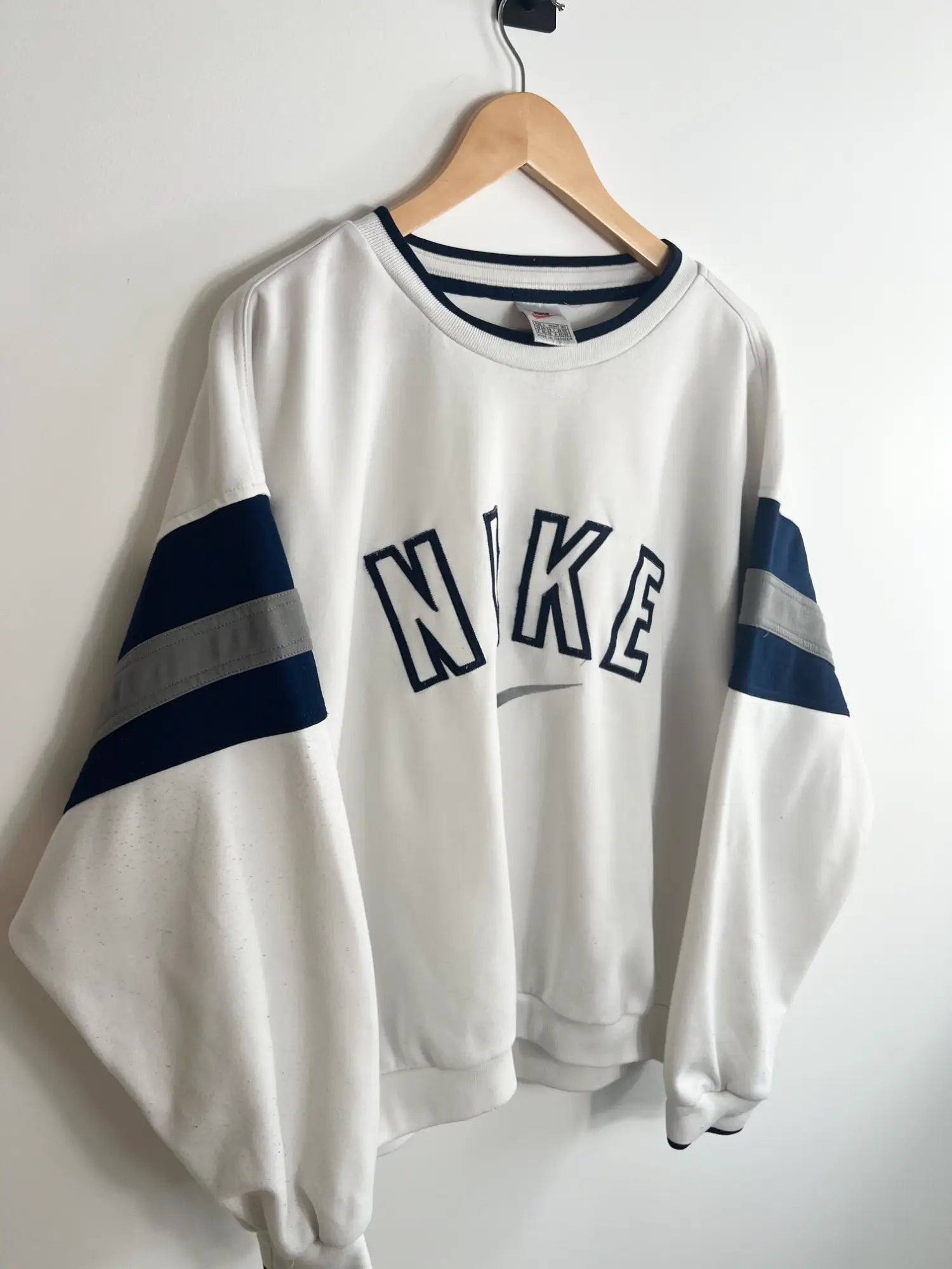 On parle ici d’un sweat iconique, comme on n’en fait plus. Le blanc, c’est la base : épuré, lumineux, facile à accorder avec tout. Et cette broderie bleu marine ? Elle claque juste comme il faut. "NIKE" écrit en toutes lettres avec le swoosh brodé, c’est simple, mais puissant. C’est le genre de détail qui fait toute la diff’ et donne direct une vibe old school stylée.