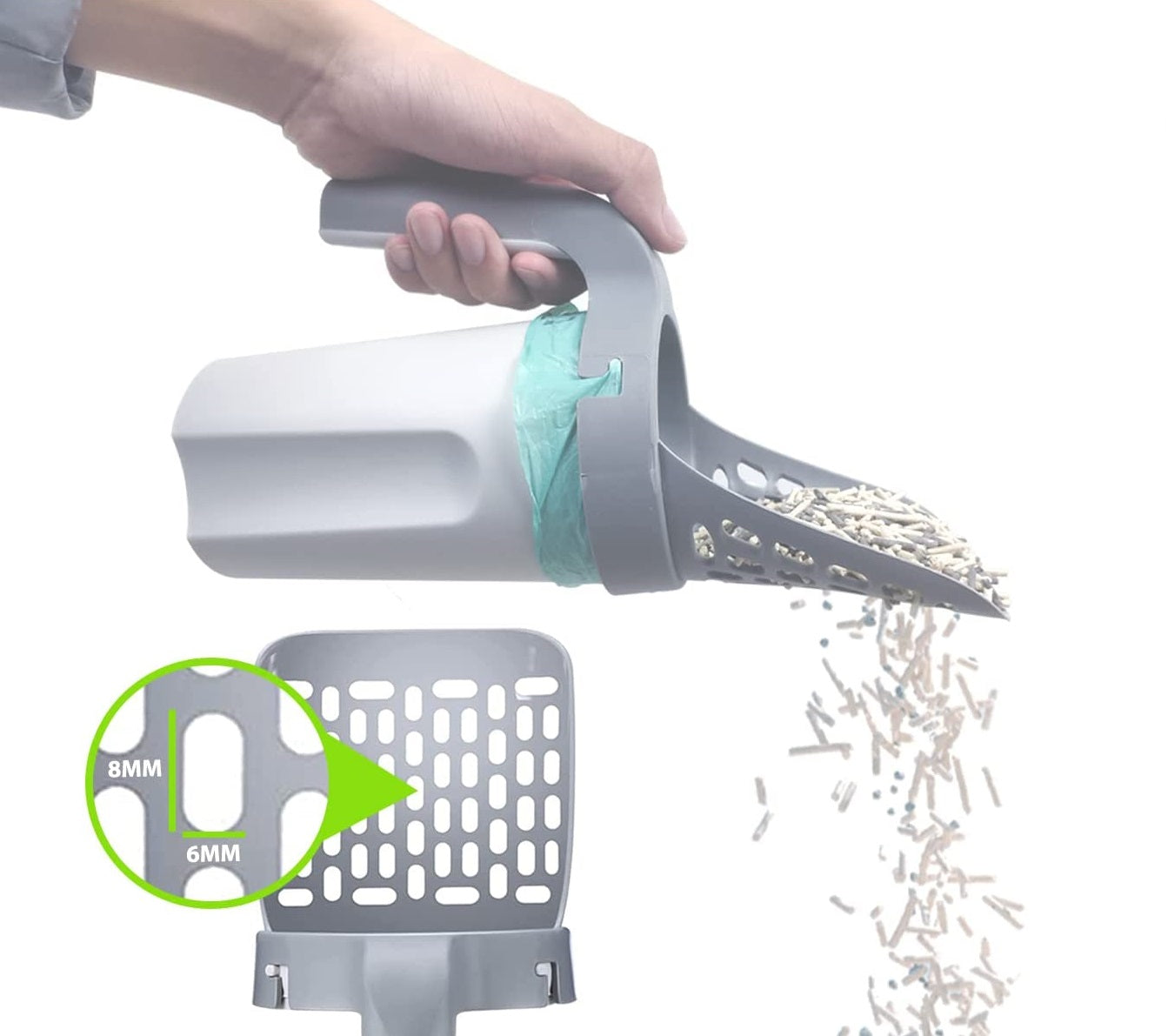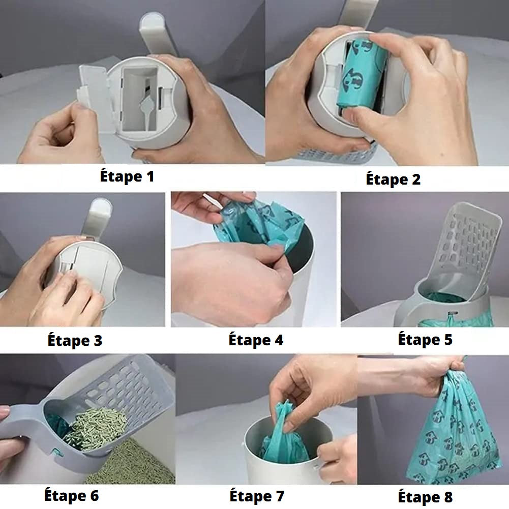 Conception pratique : avec son sac intégré, la pelle à litière facilite le nettoyage et évite les déchets dans votre espace de vie.