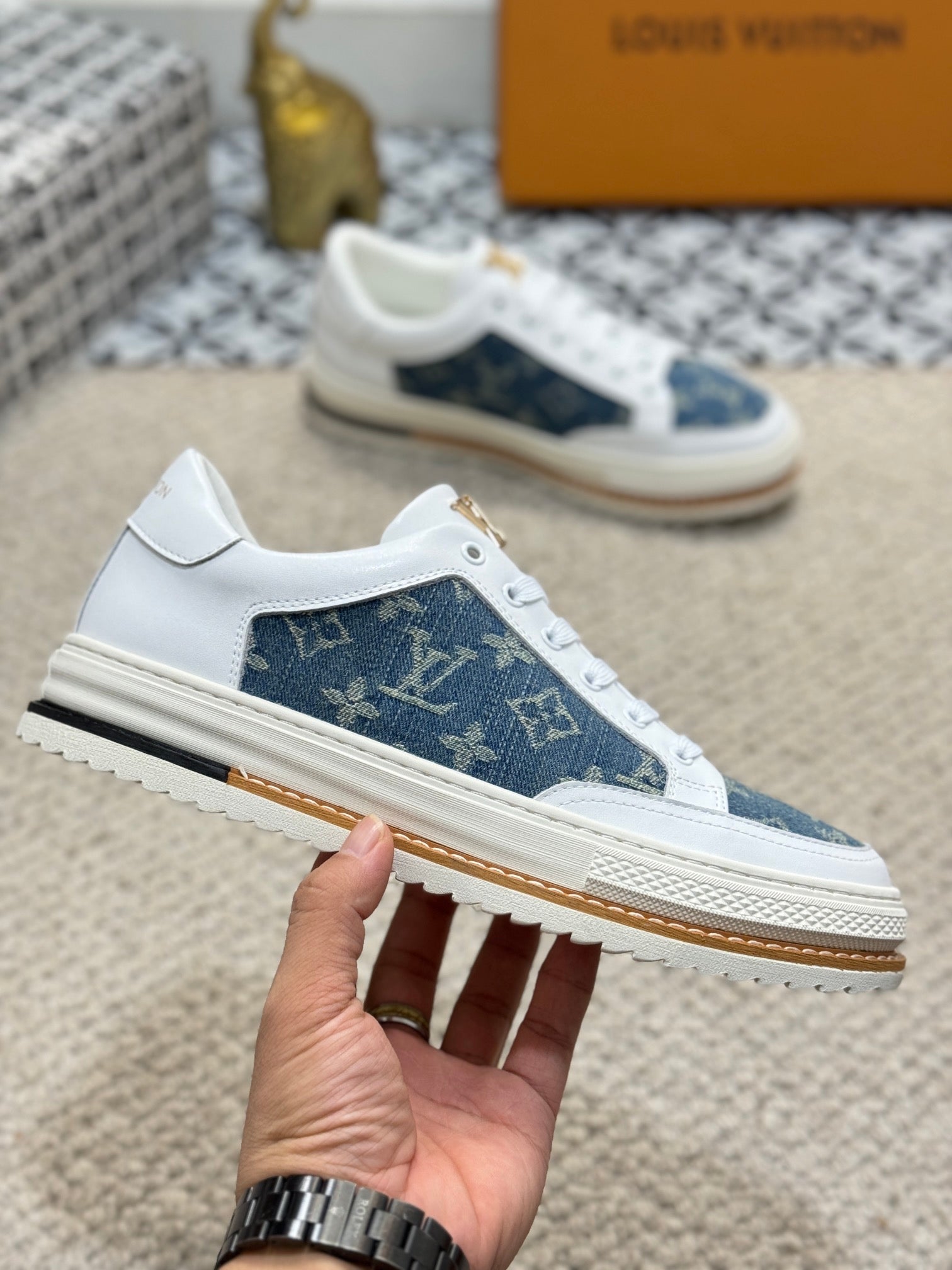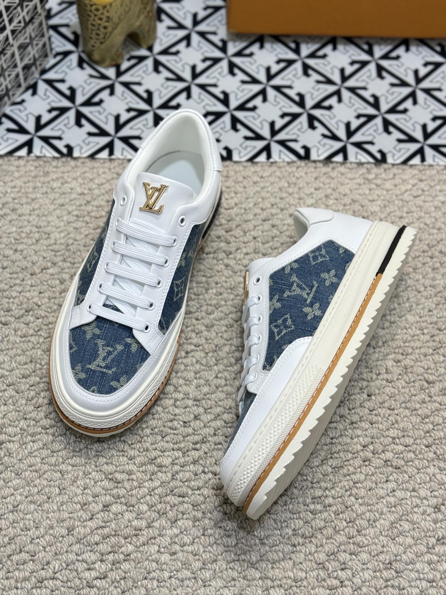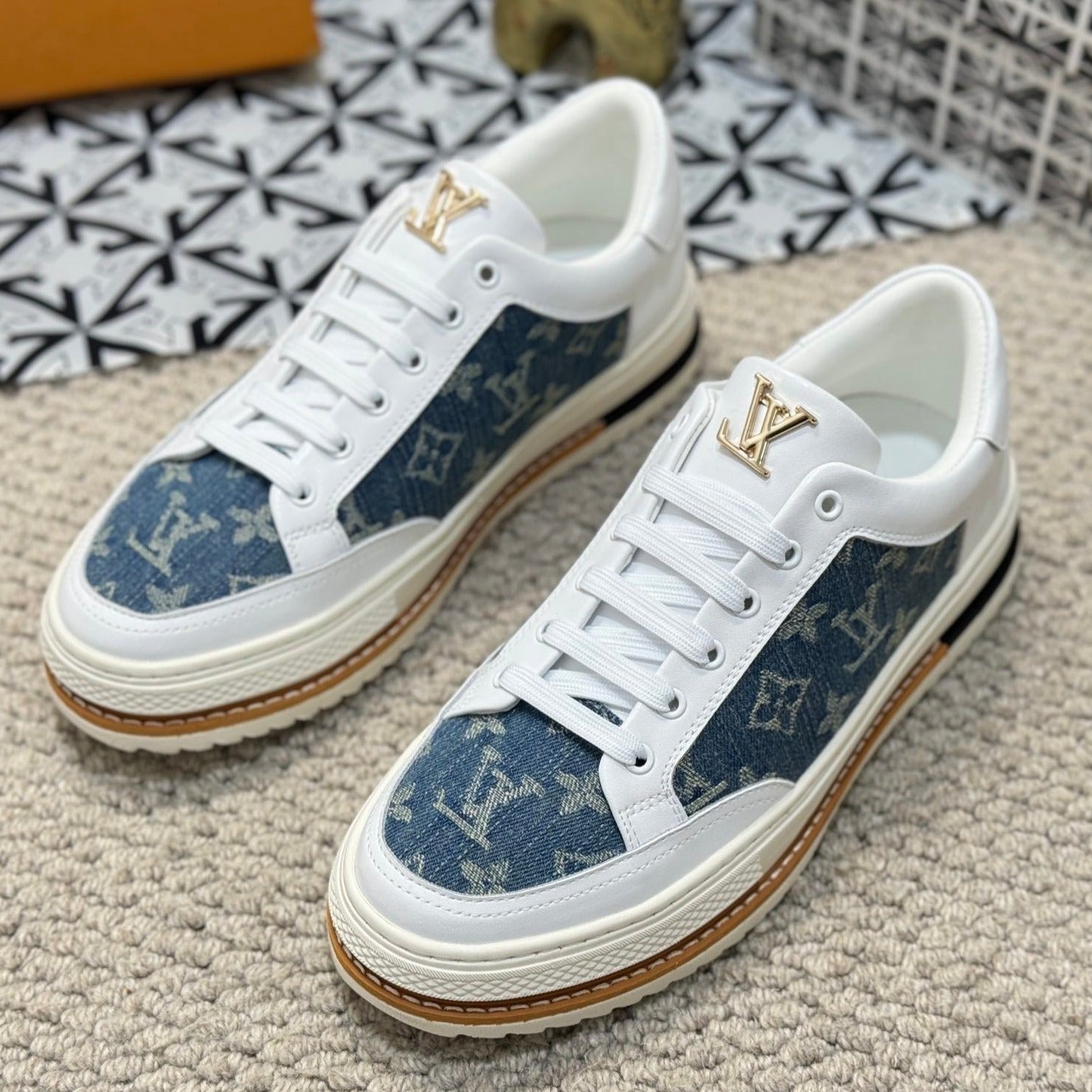 LV TRAINERS IN WHITE CALFSKIN AND BLUE DENIM JACQUARD