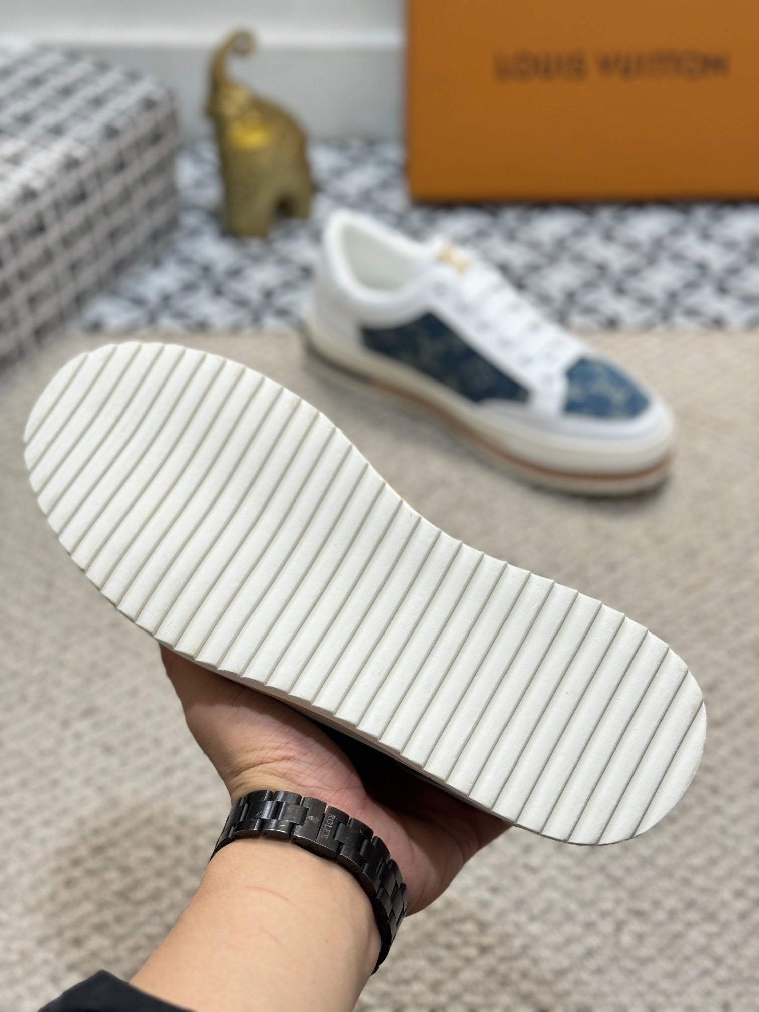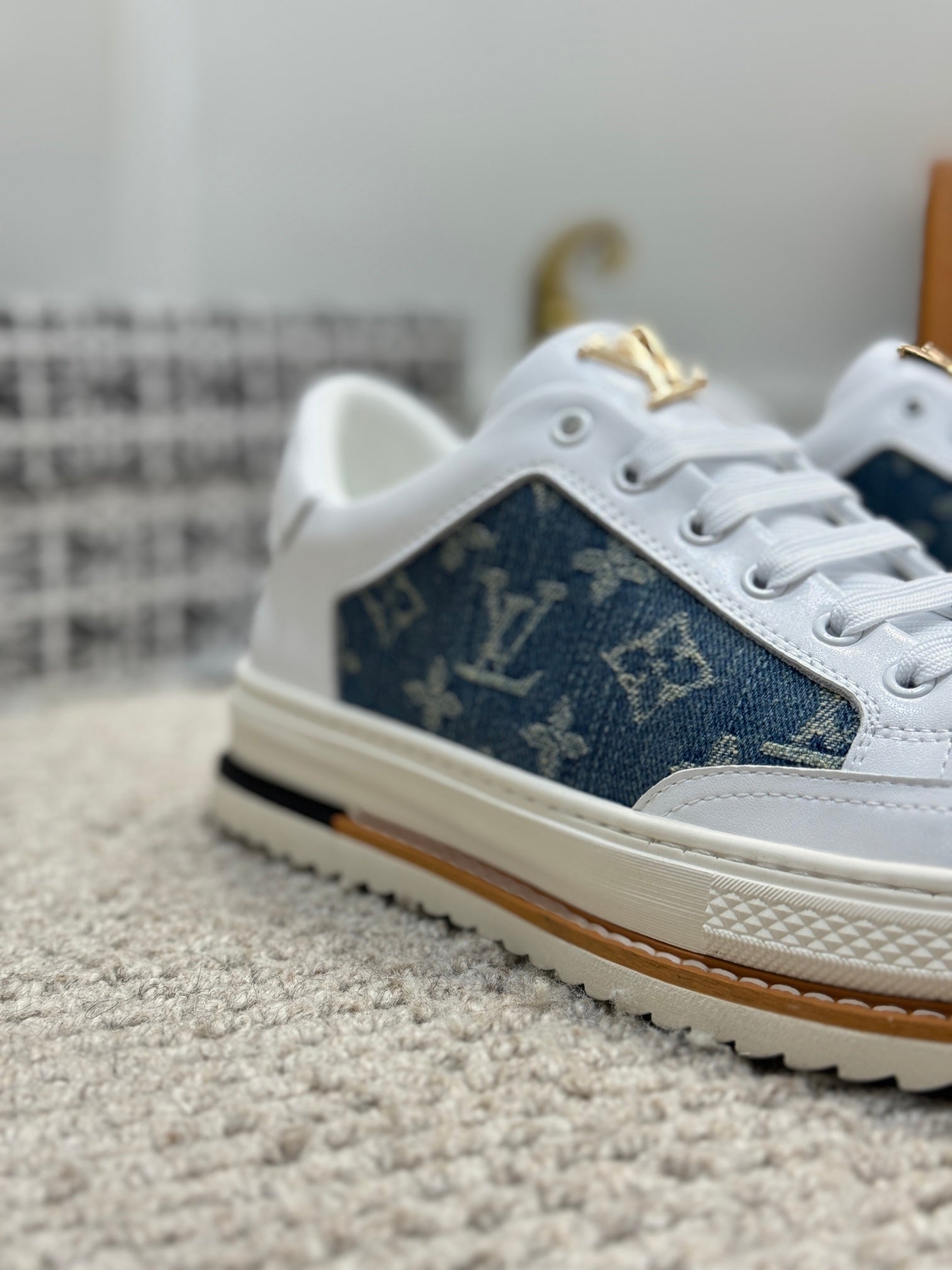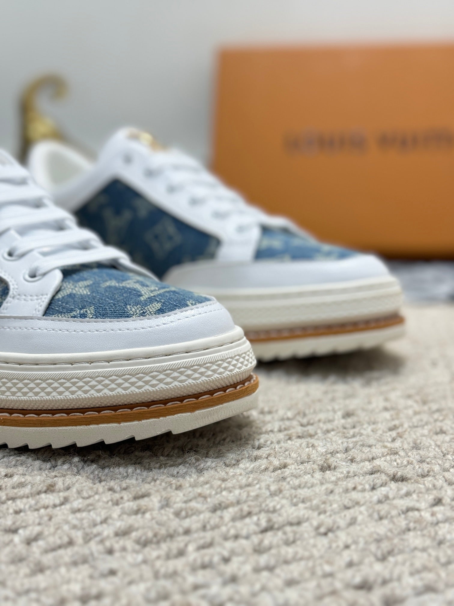 LV TRAINERS IN WHITE CALFSKIN AND BLUE DENIM JACQUARD