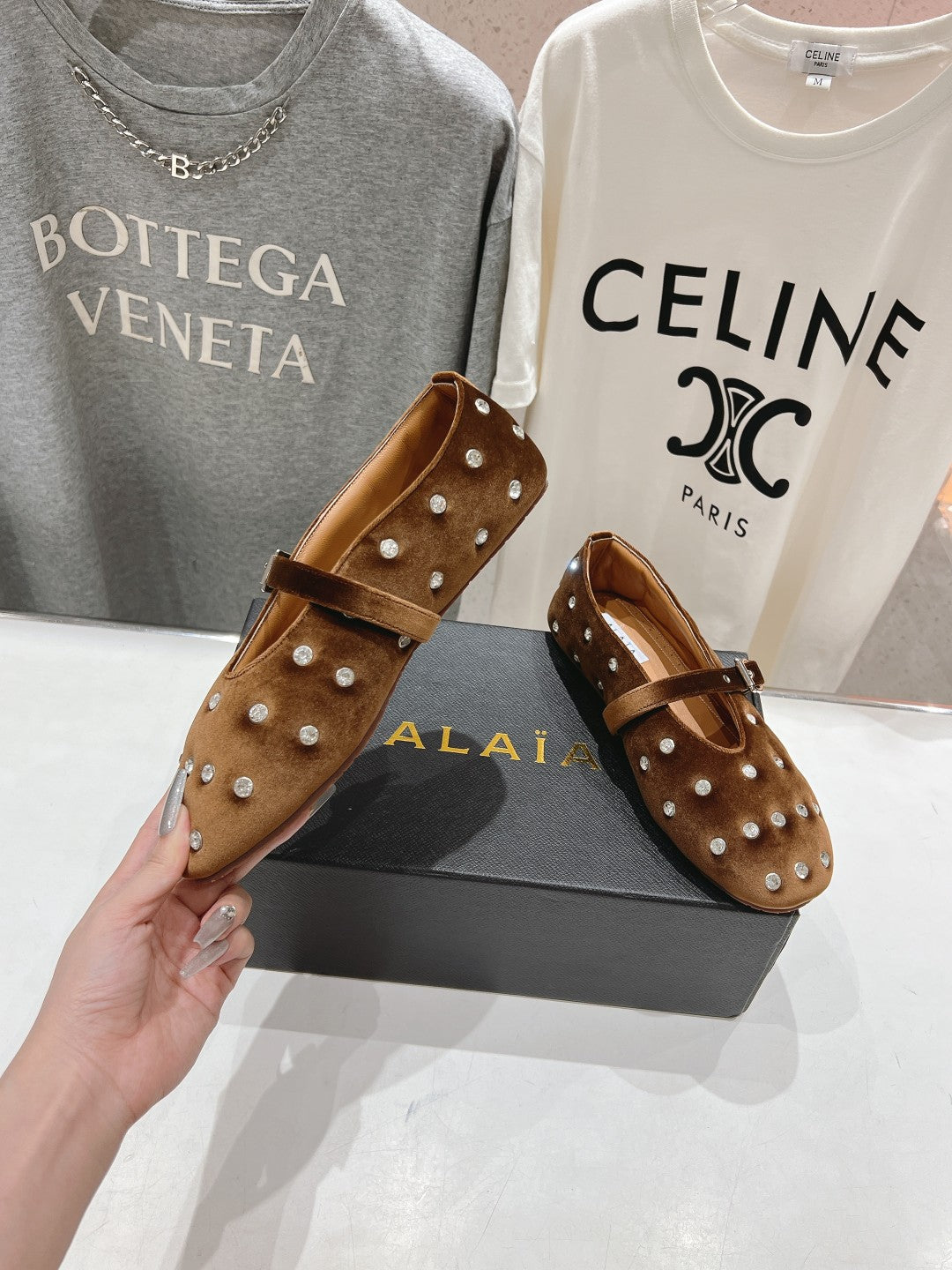 Alaila Ballet Flats In Moss Brown Velvet With Rhinestones 971998
