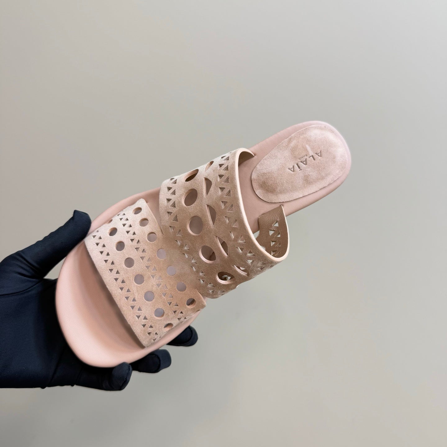 Alaia Vienne Cutout Kitten-Heel Slide Sandals Pink Sheepskin 299665
