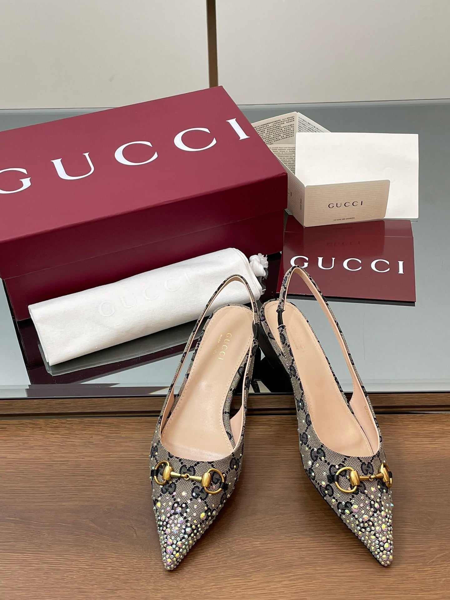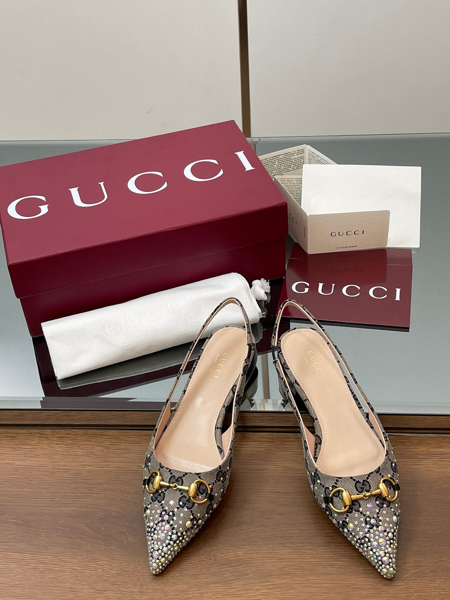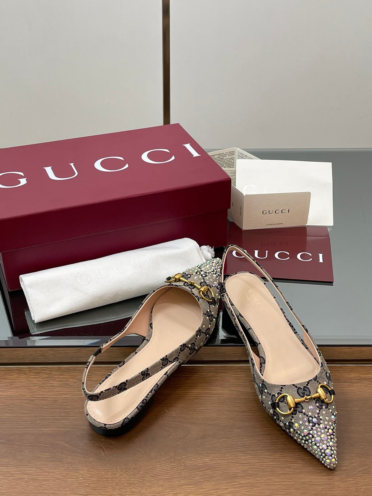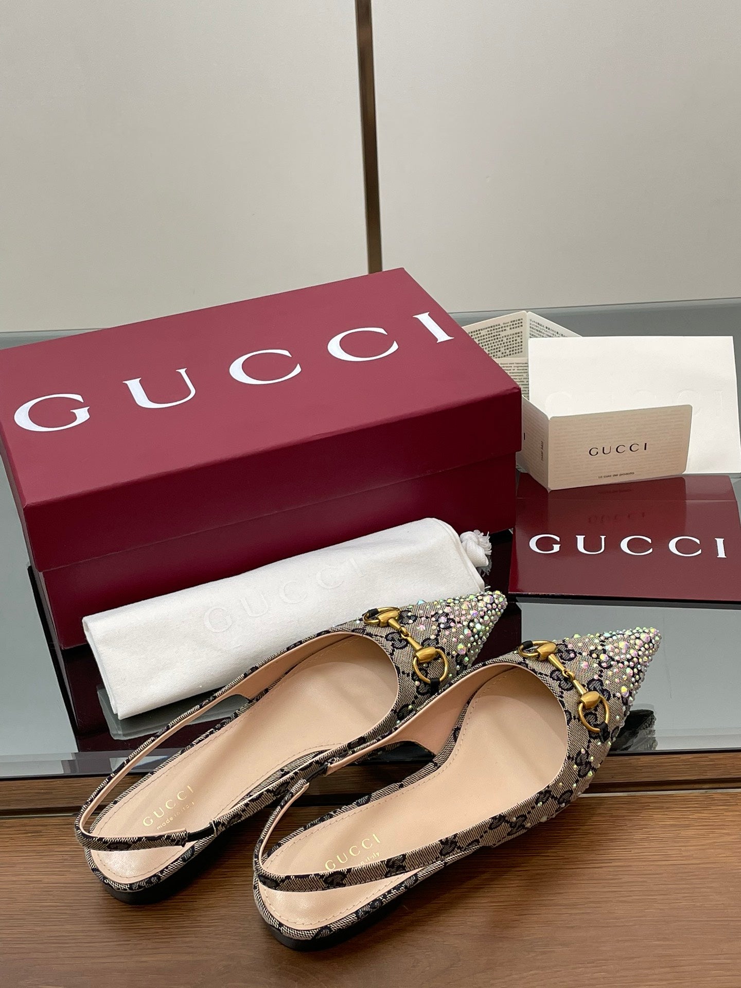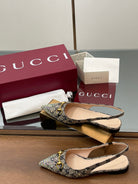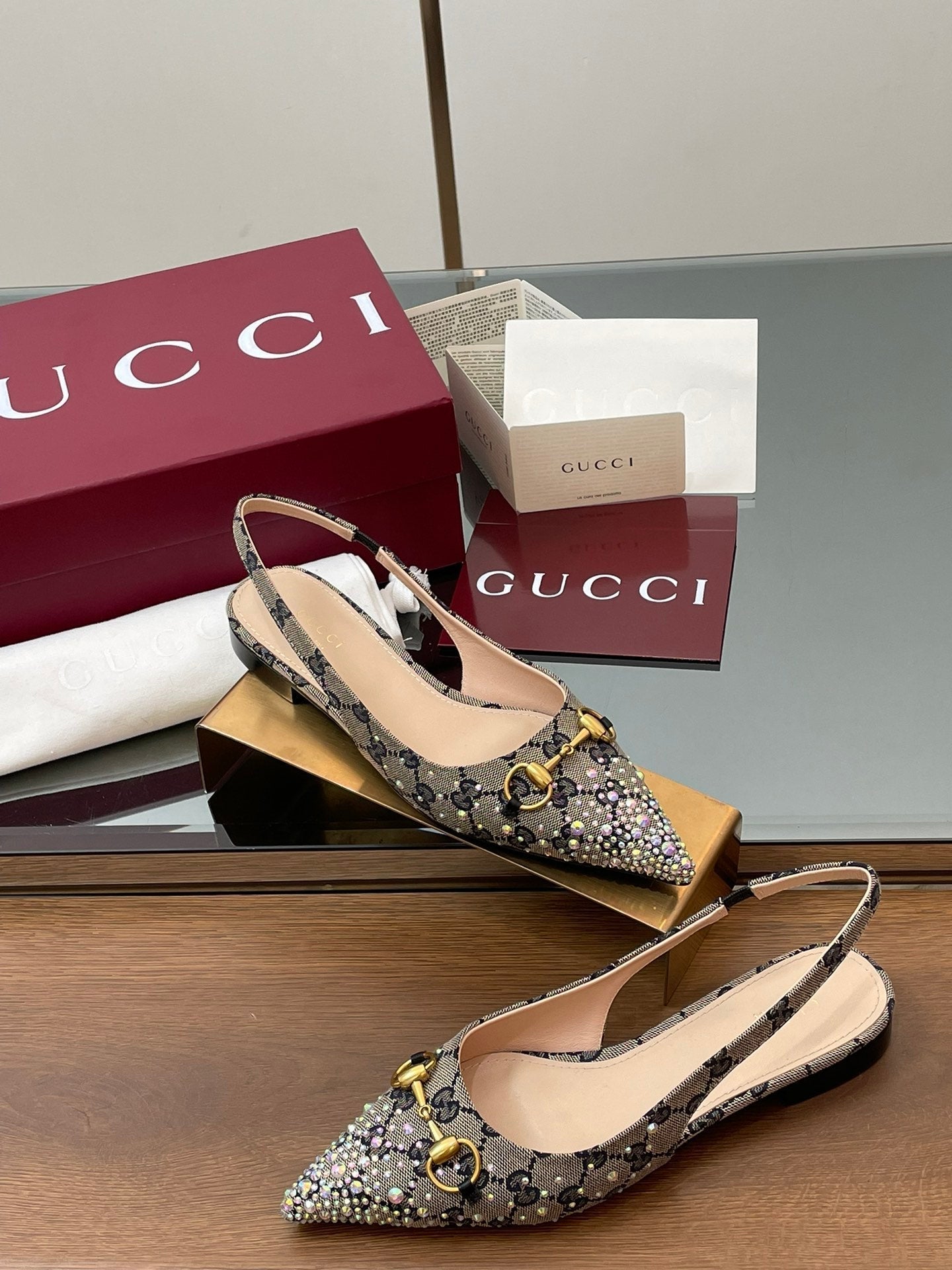 GG Horsebit Slingback Flat Black Ebony Monogram Canvas Point Toe Crystal-Embellished