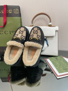 GG LOAFER IN CAMEL BROWN JACQUARD AND BLACK CALFSKIN WITH BEIGE WOOL LINING