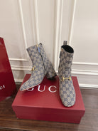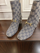 Gucci Horsebit Chunky Heel Ankle Boots Blue Ebony Cowhide Fabric 490558