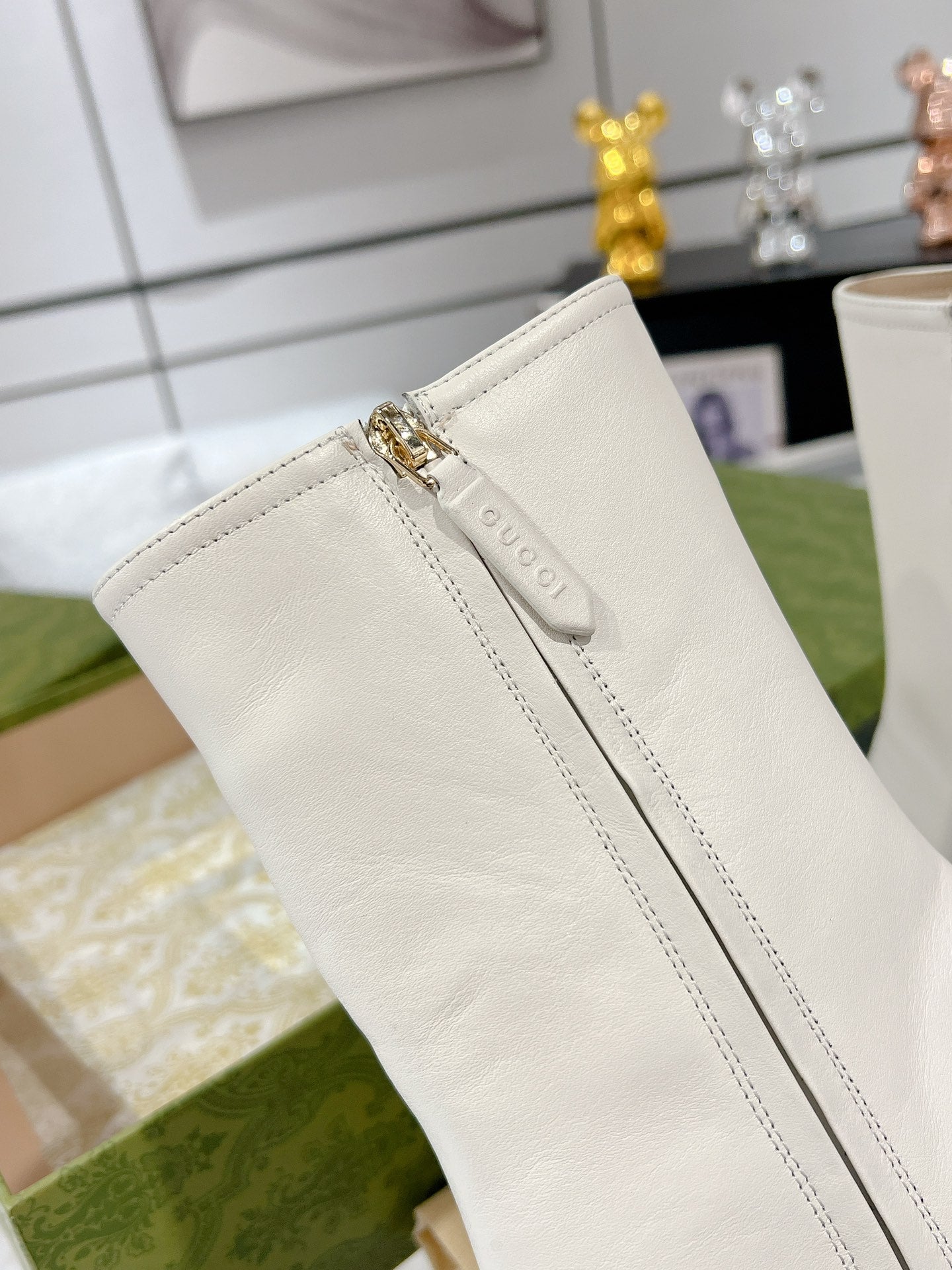 Gucci Horsebit Square Toe Mid-heeled Ankle Boots White Cowhide 490536