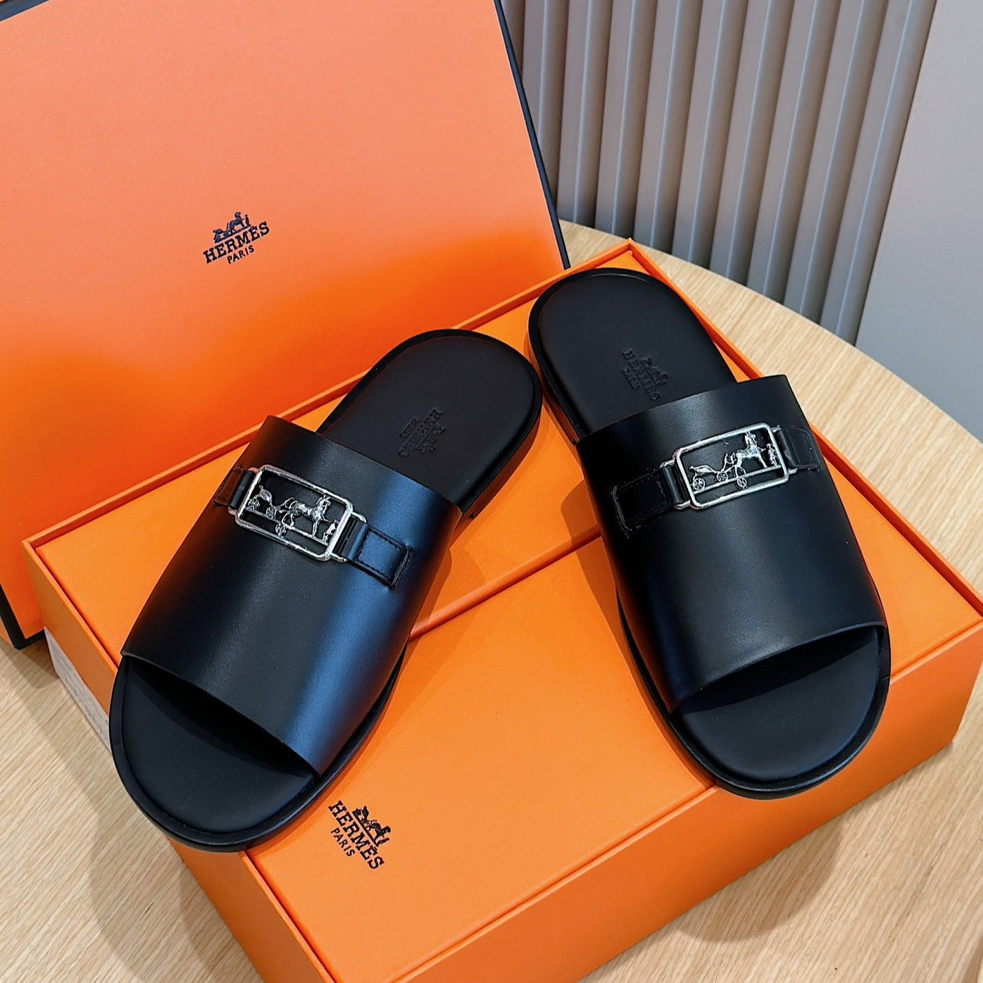 HM SILVER BUCKLE SLIPPERS BLACK CALFSKIN