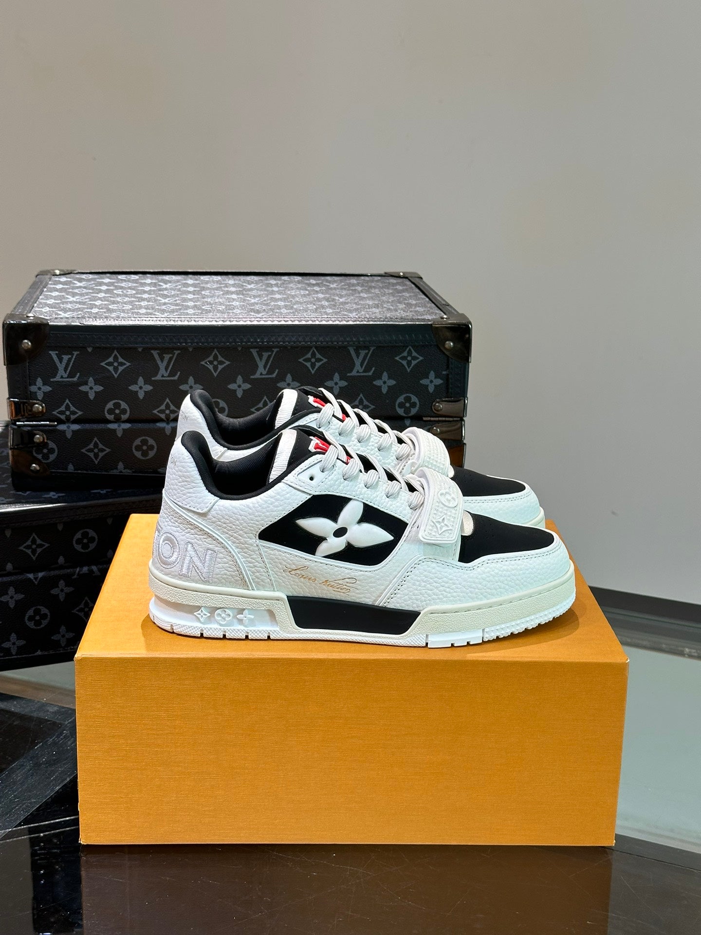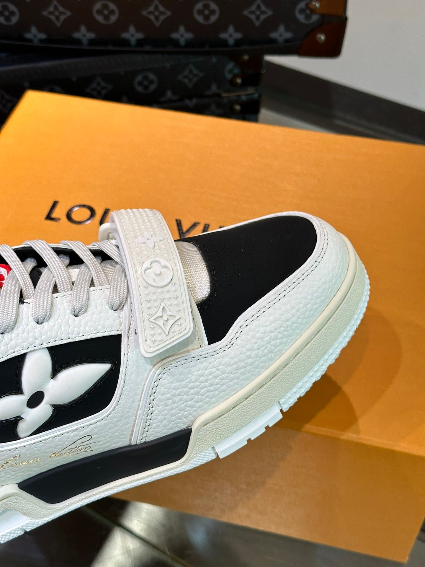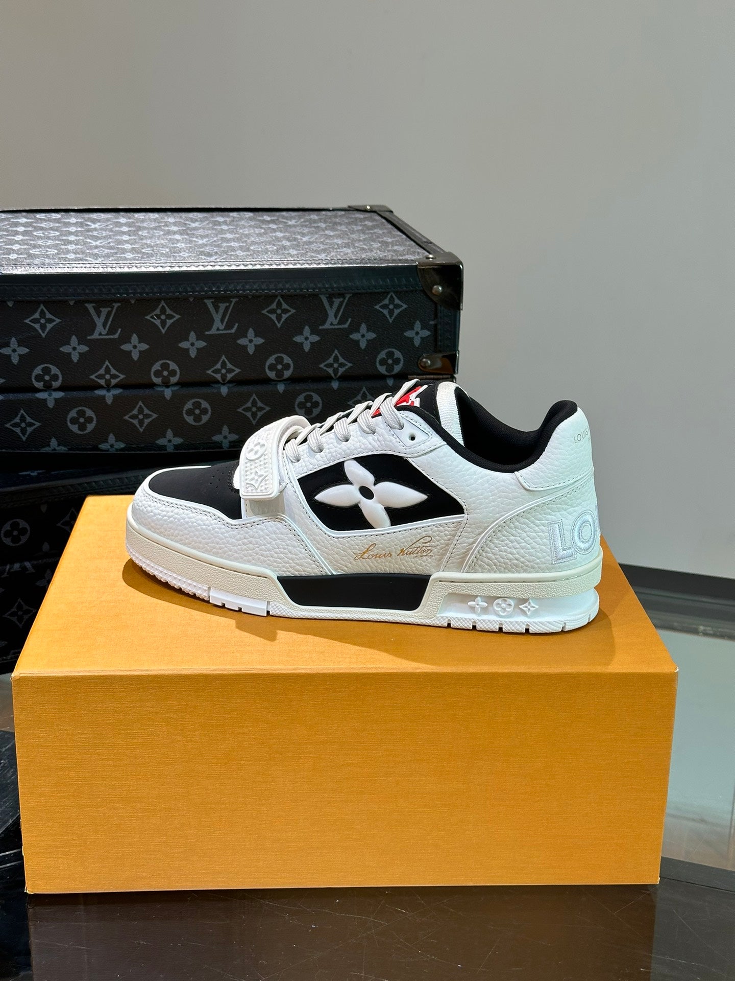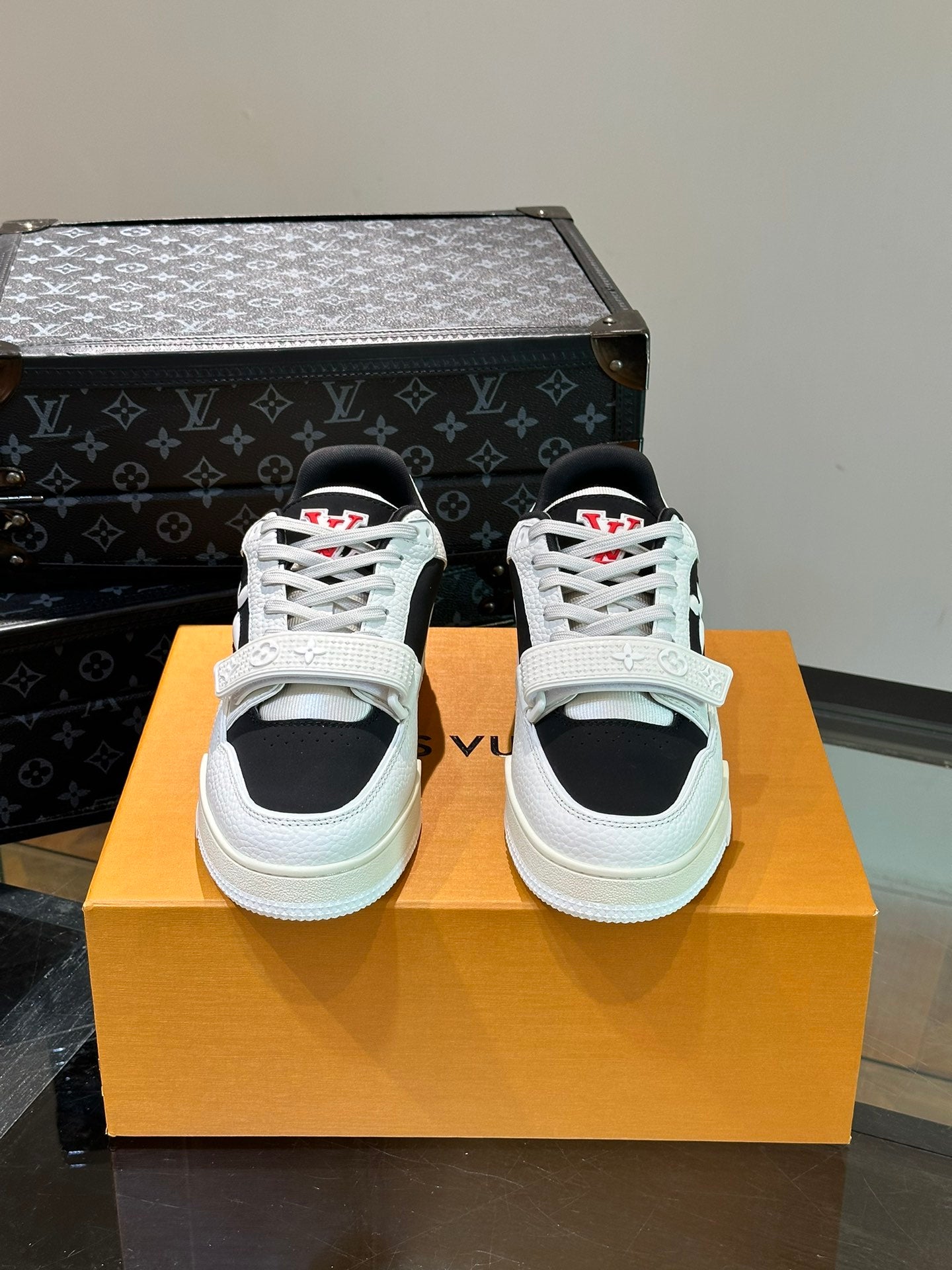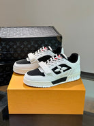 LV TRAINER SNEAKERS IN WHITE CALFSKIN AND BLACK SUEDE