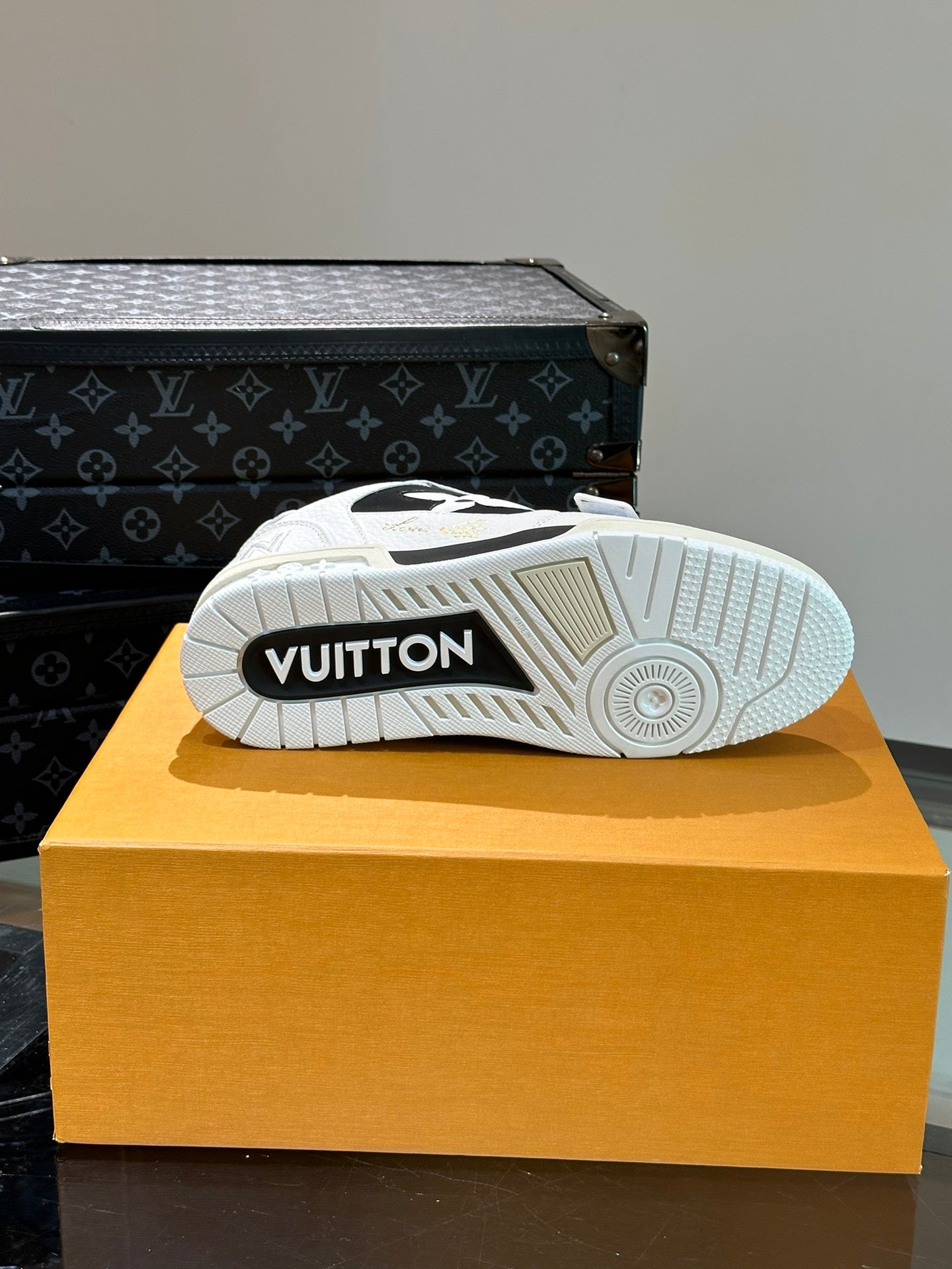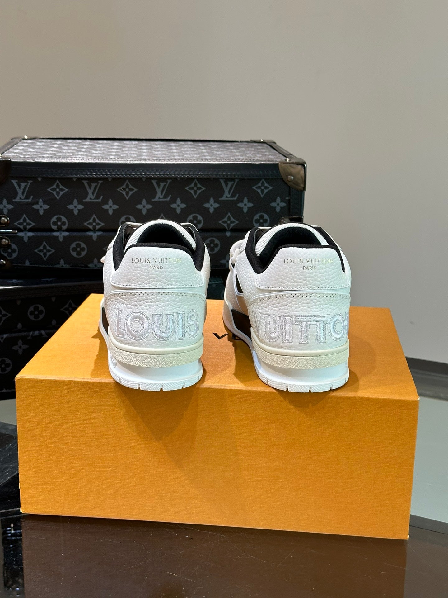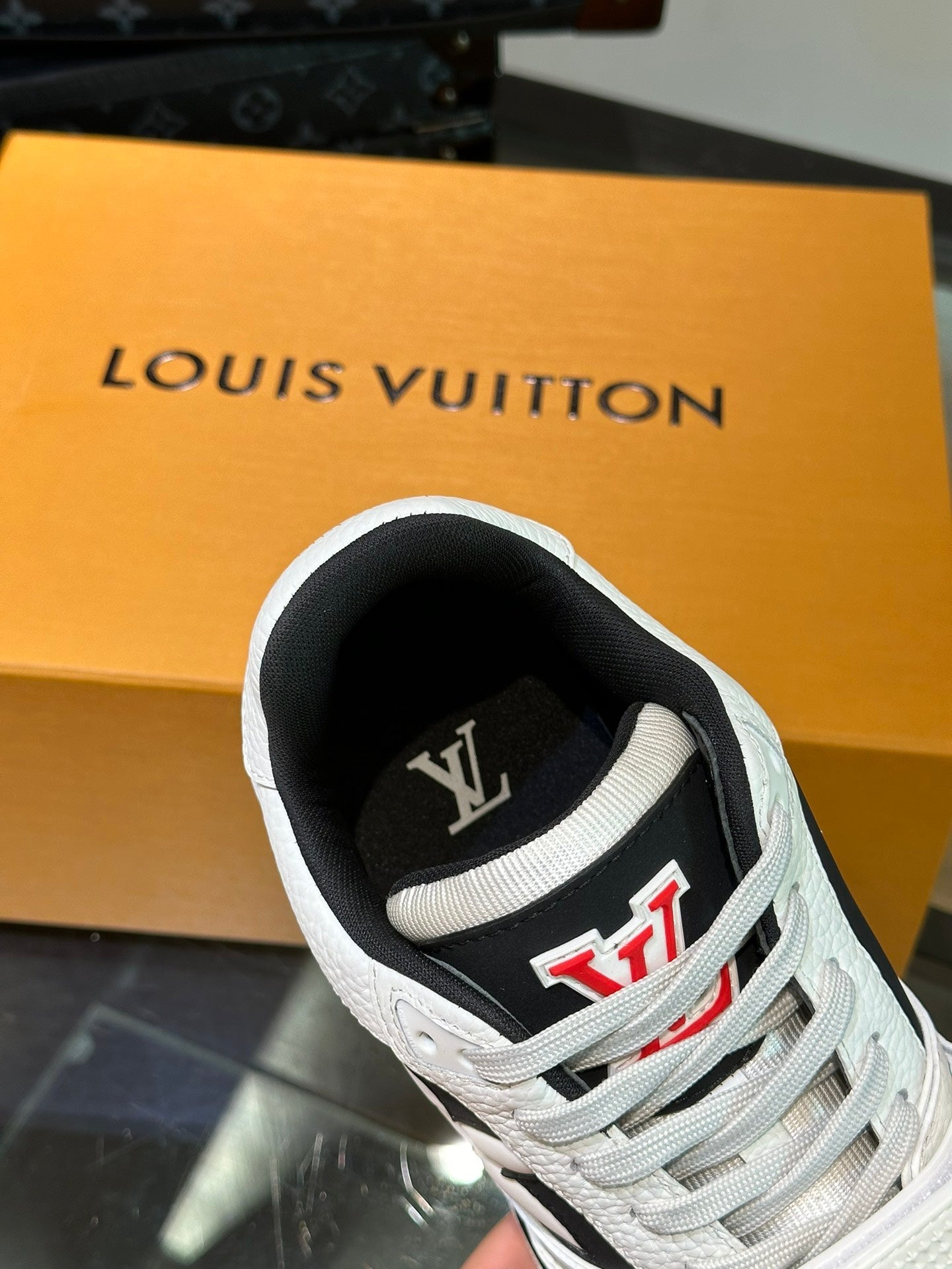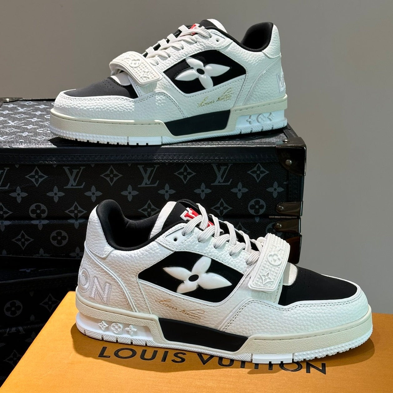 LV TRAINER SNEAKERS IN WHITE CALFSKIN AND BLACK SUEDE