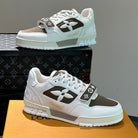 LV TRAINER SNEAKERS IN WHITE CALFSKIN AND MOCHA BROWN SUEDE