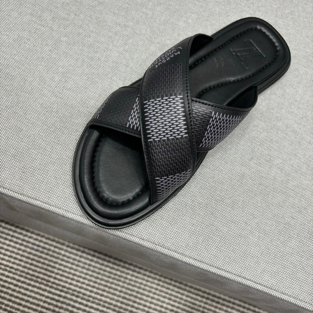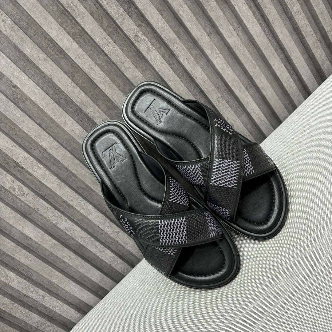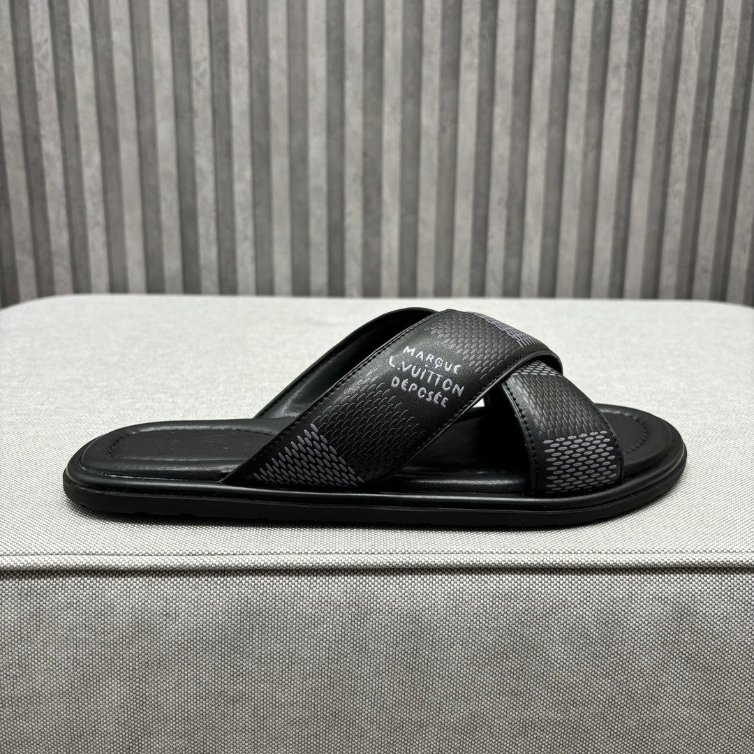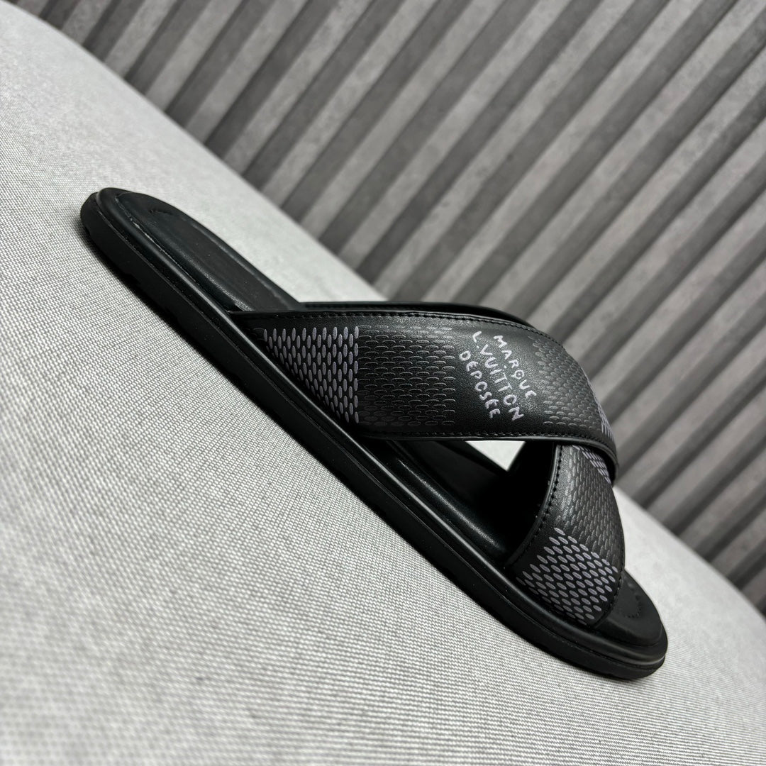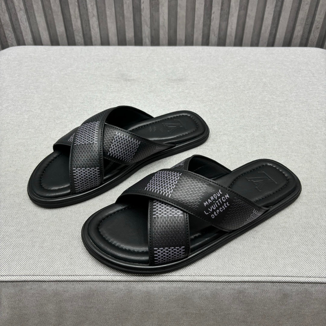 • Premium LV men's slippers, synchronizing with the 2024 early autumn runway collection. The slippers feature a high-quality fabric upper and an original, exclusive comfort sole, ensuring exceptional comfort. These are original factory-followed products.