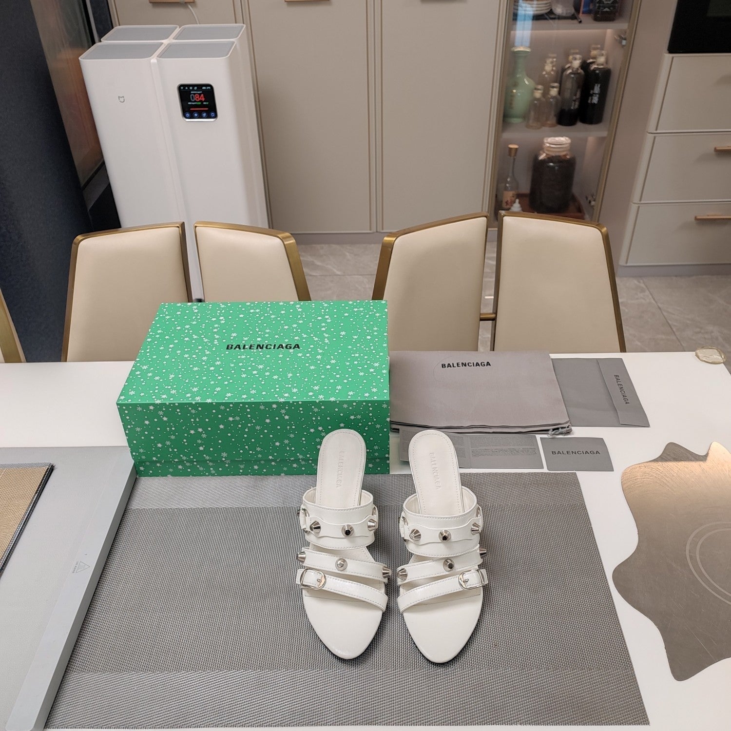 STRAPPY HIGH-HEELED SANDALS IN WHITE STUDDED WAX-OIL SHEEPSKIN