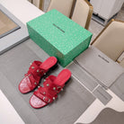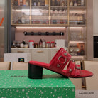 STRAPPY MEDIUM HEELED SANDALS IN RED STUDDED WAX-OIL SHEEPSKIN