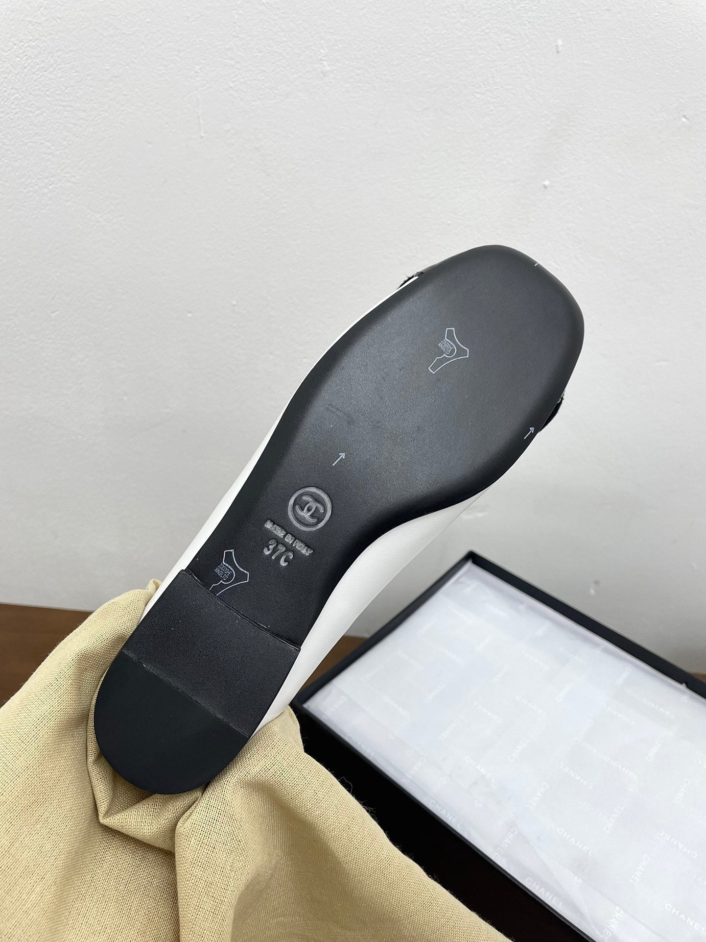 CC Ballet Flats White With Camellia Black Lambskin