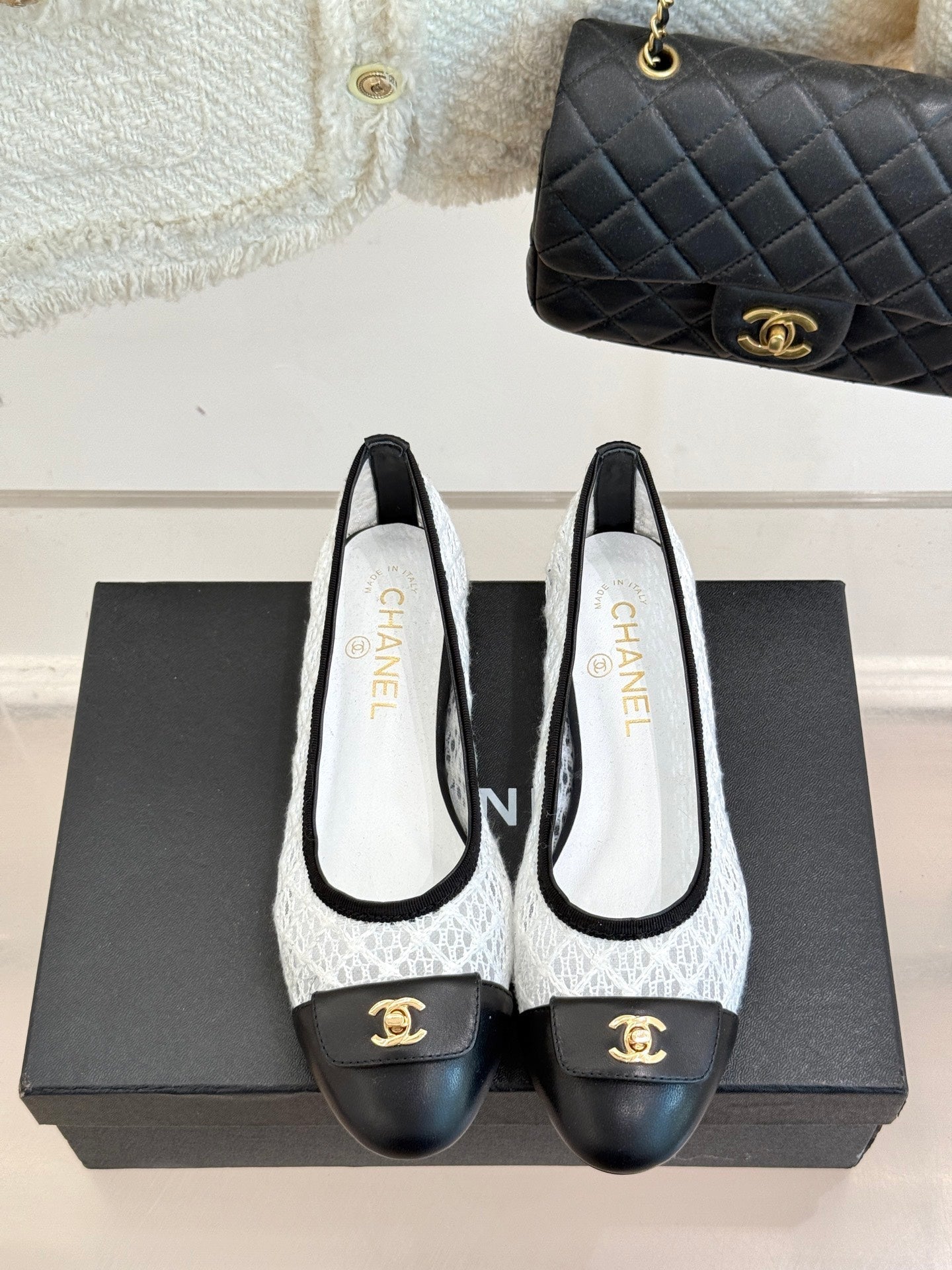 Chanel 25 Ballet Flat White Black Woven Lambskin 473057