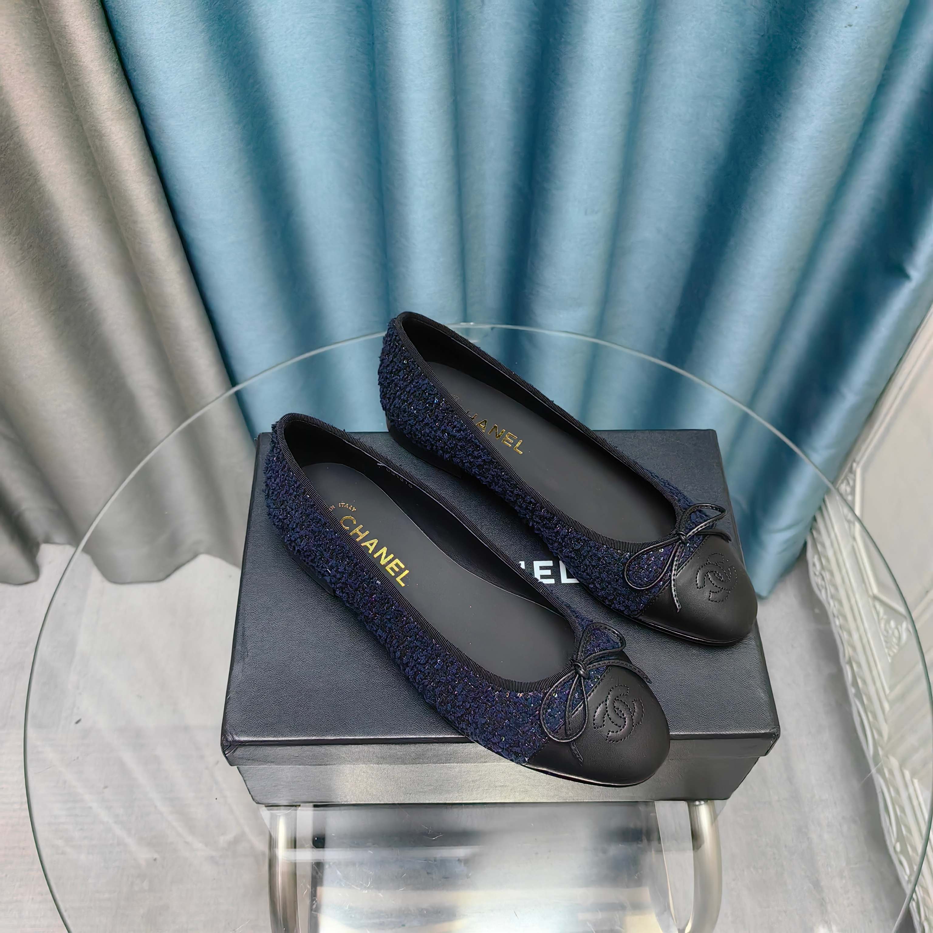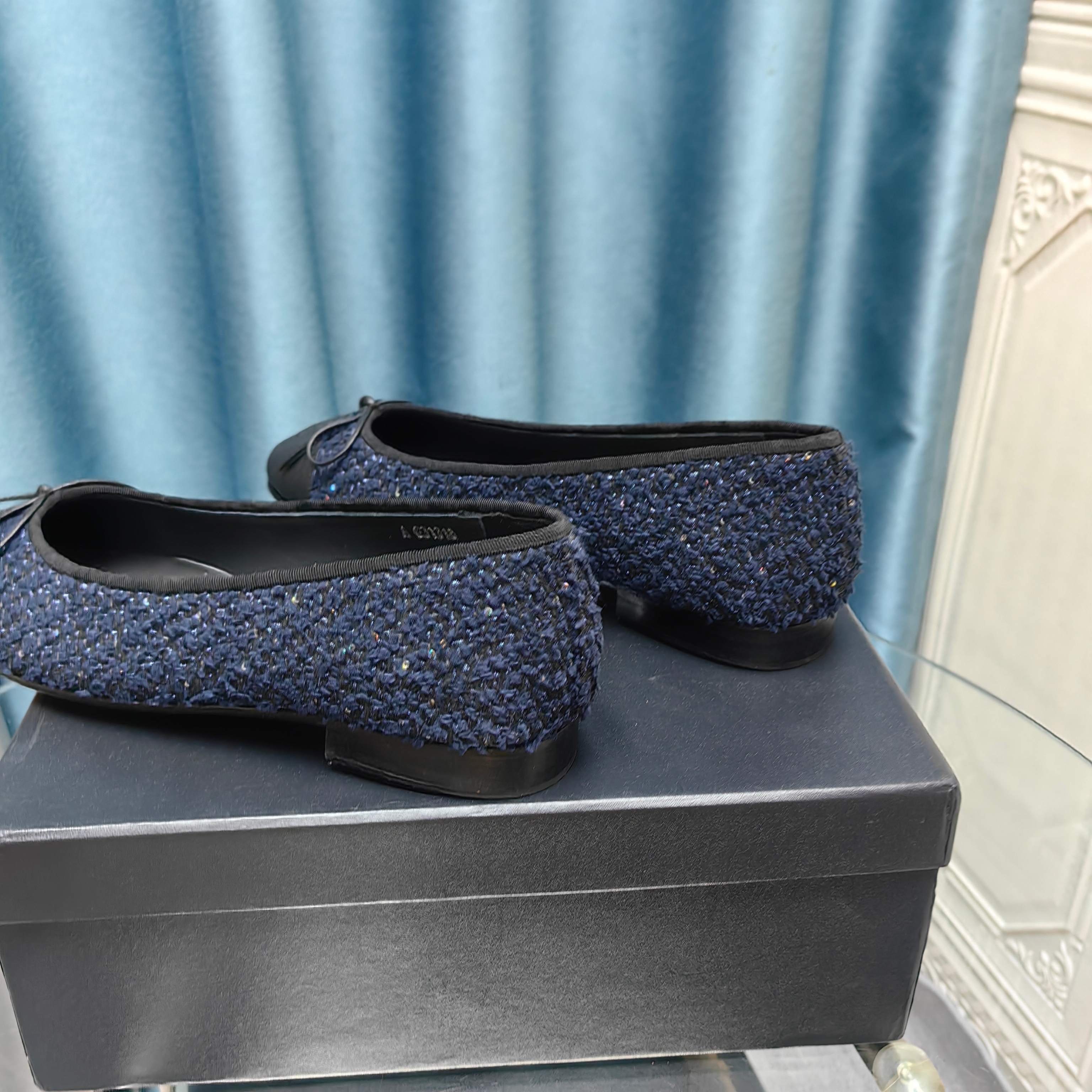 CC 25P Ballet Flat Dark Blue Tweed Black Calfskin