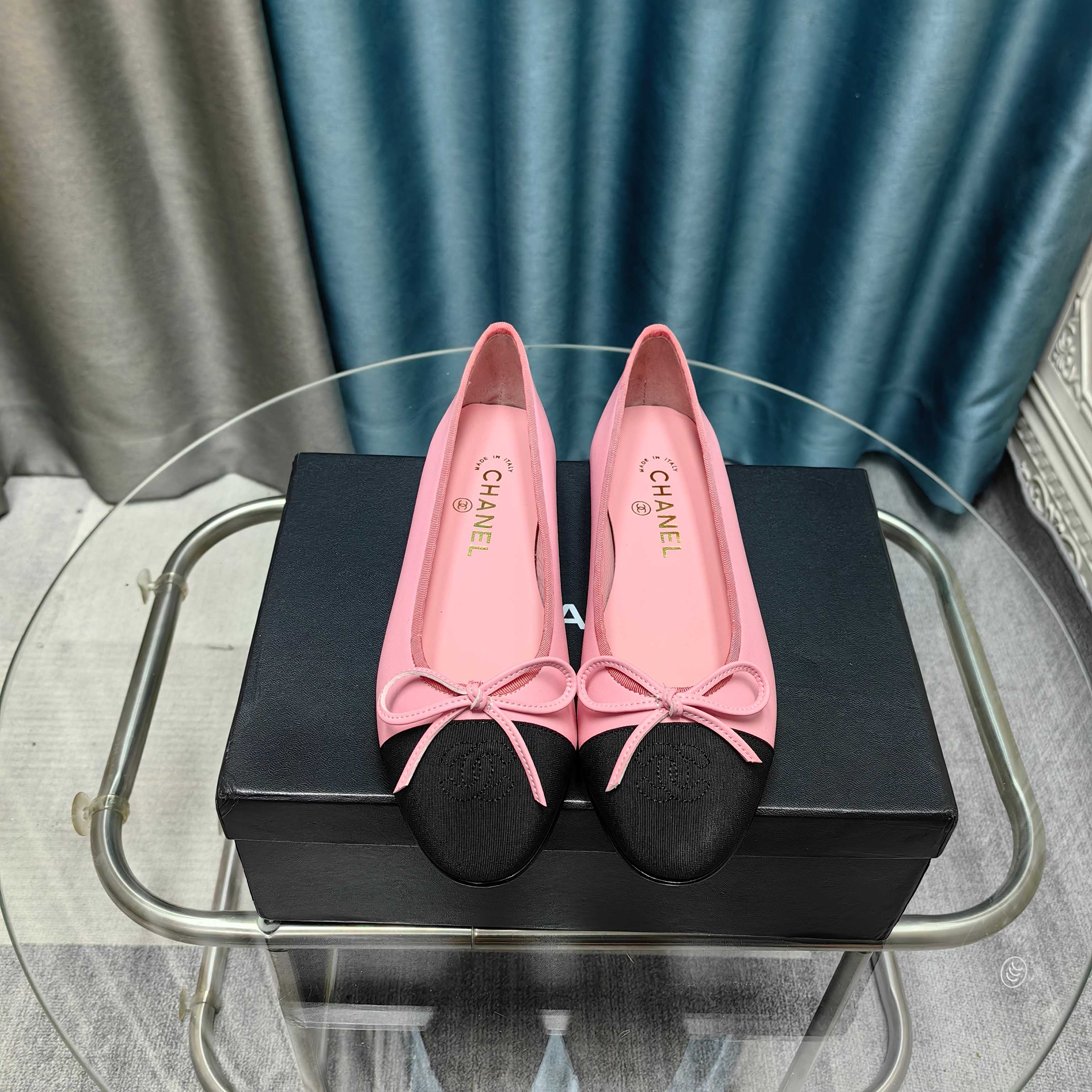CC 25P Ballet Flat Pink Calfskin Black Grosgrain
