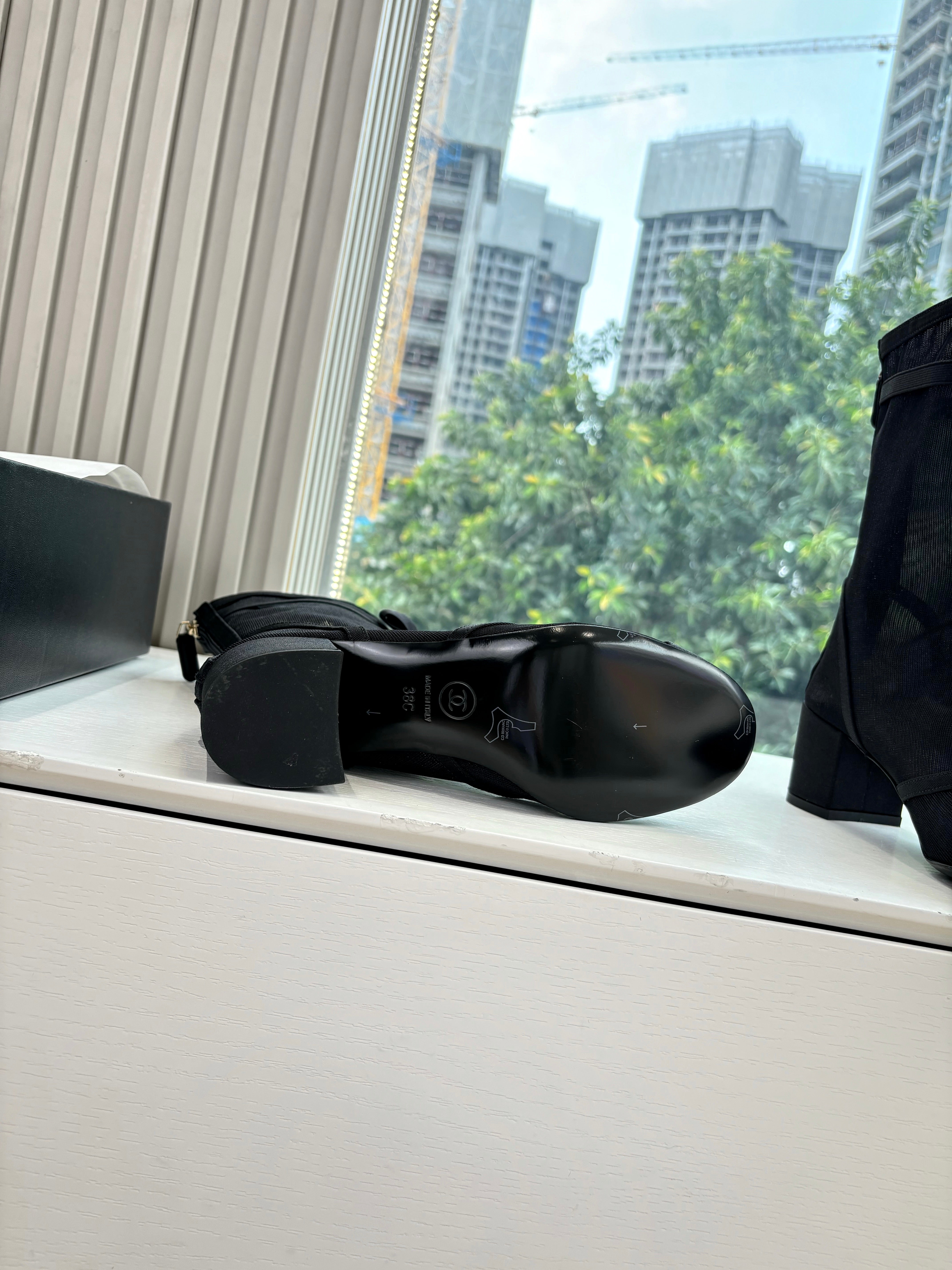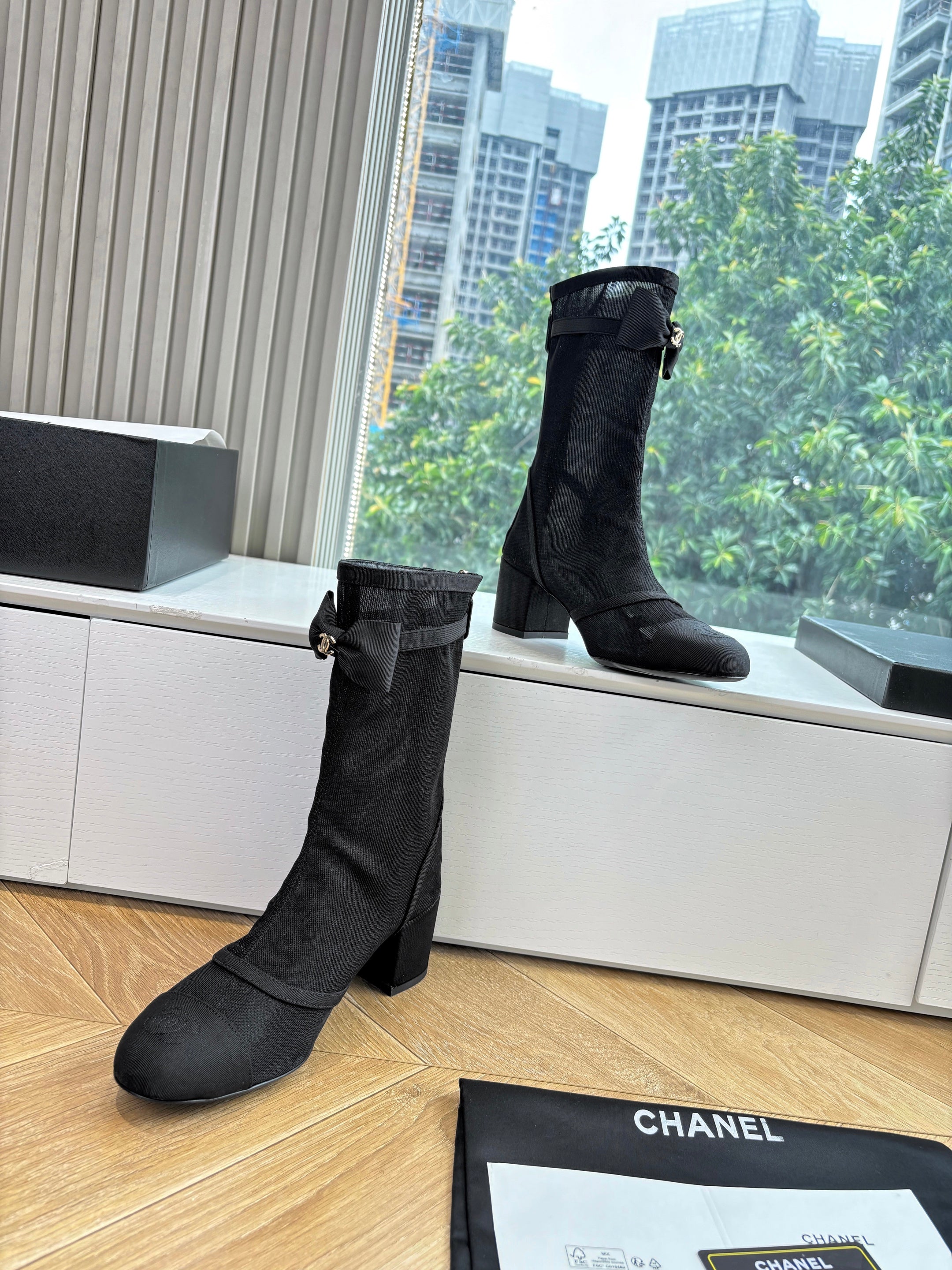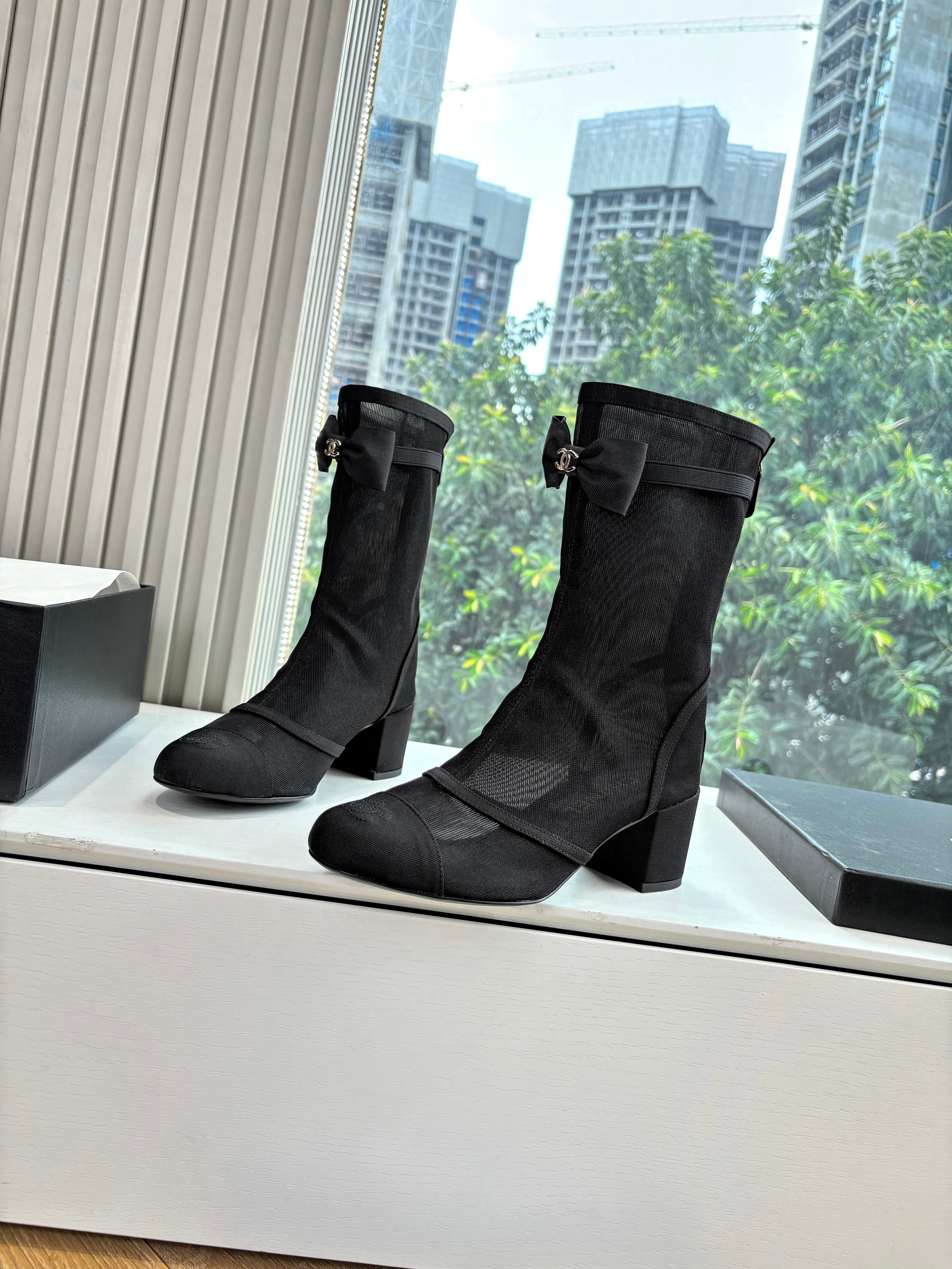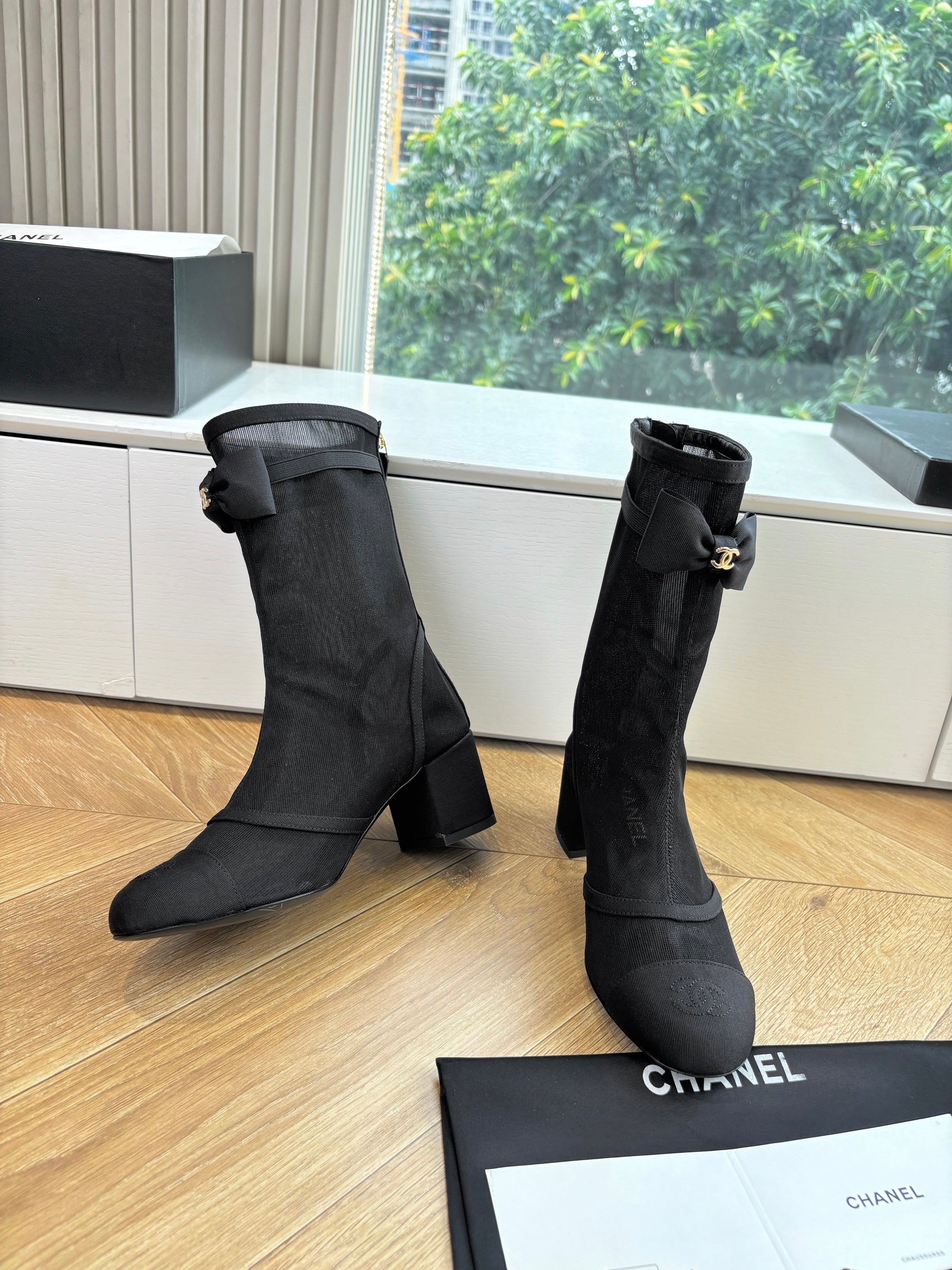 CC 25 Short Boot Black Mesh Calfskin Black Bow 430322