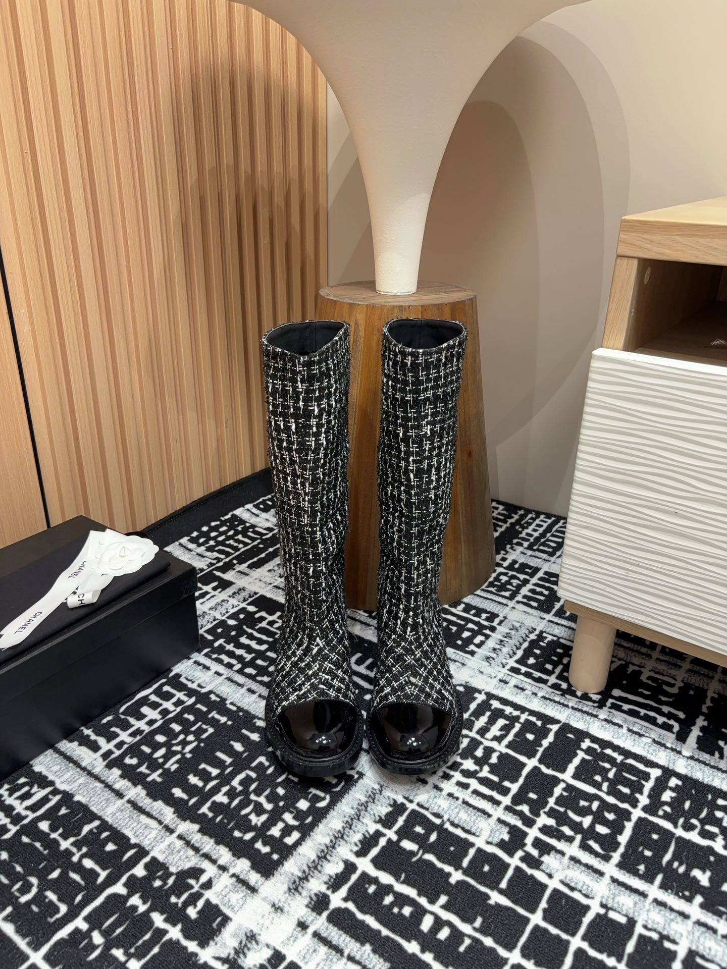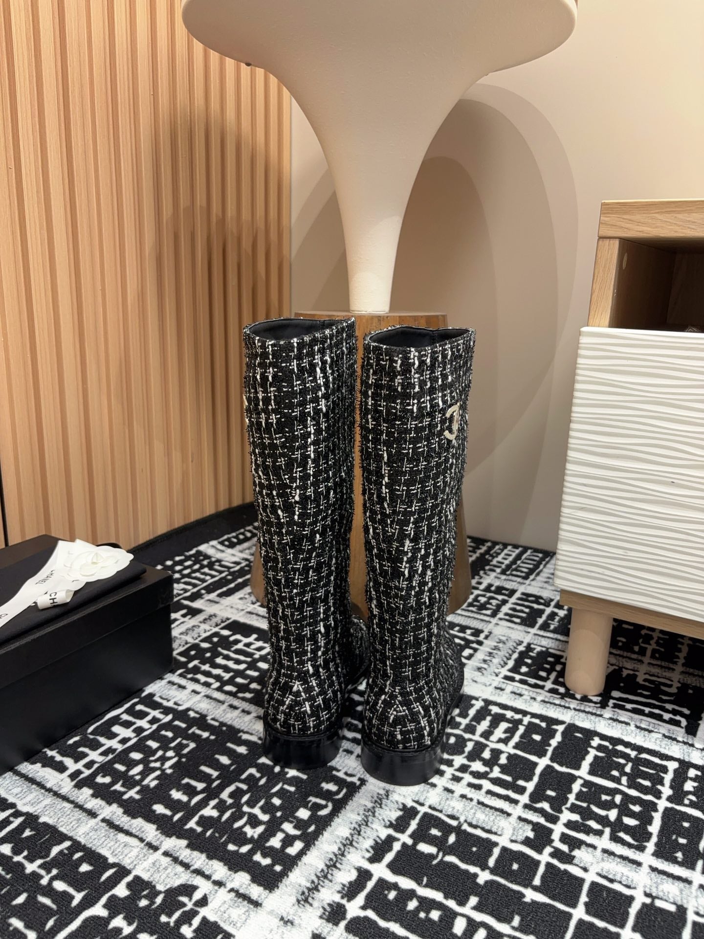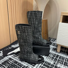 CC High Boots In Black Mix White Wool Tweed And Lambskin