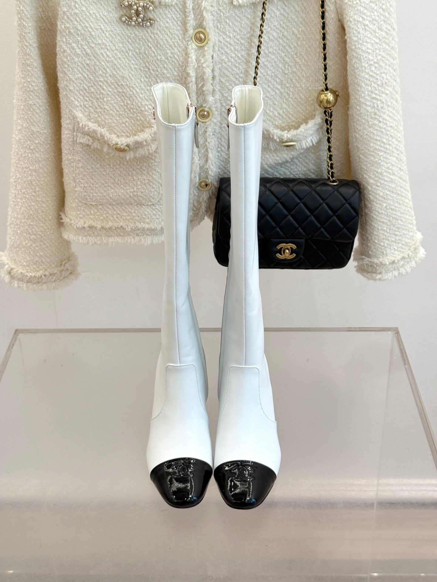 Chanel Double C Colorblock Heel Long Boot Black Sheepskin 465417