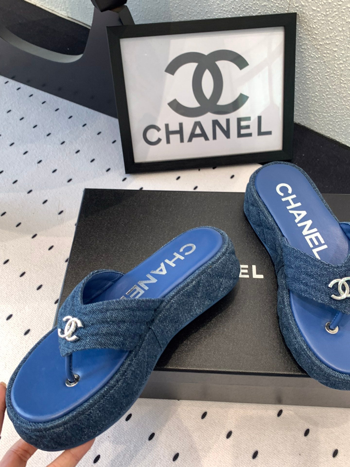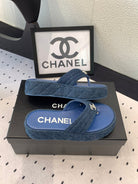 CC Thong Slippers In Navy Blue Denim Fabric 147052