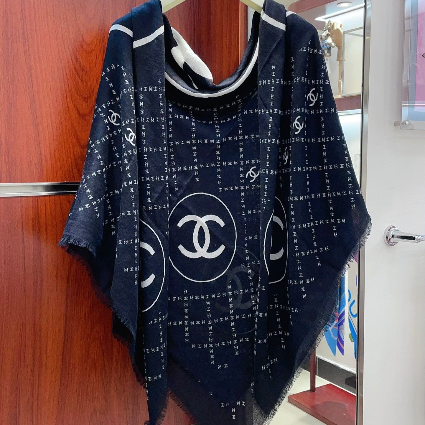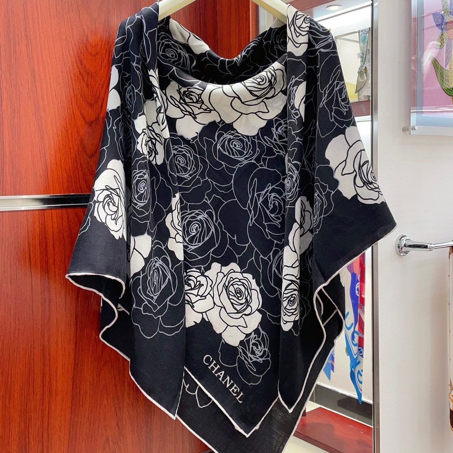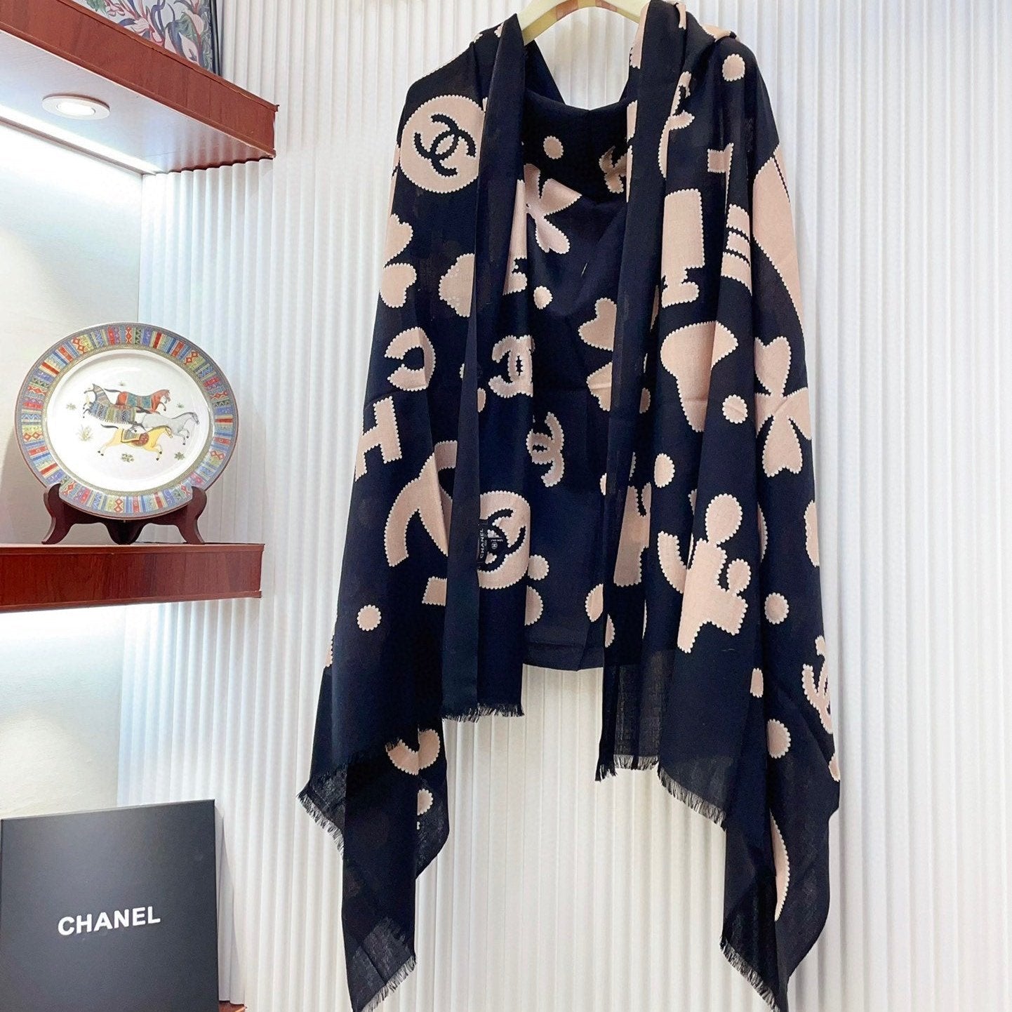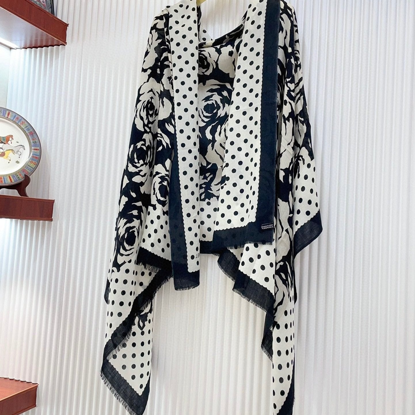 CC Scarf 185 CM In White Black Printed Pattern Cashmere Silk 371904