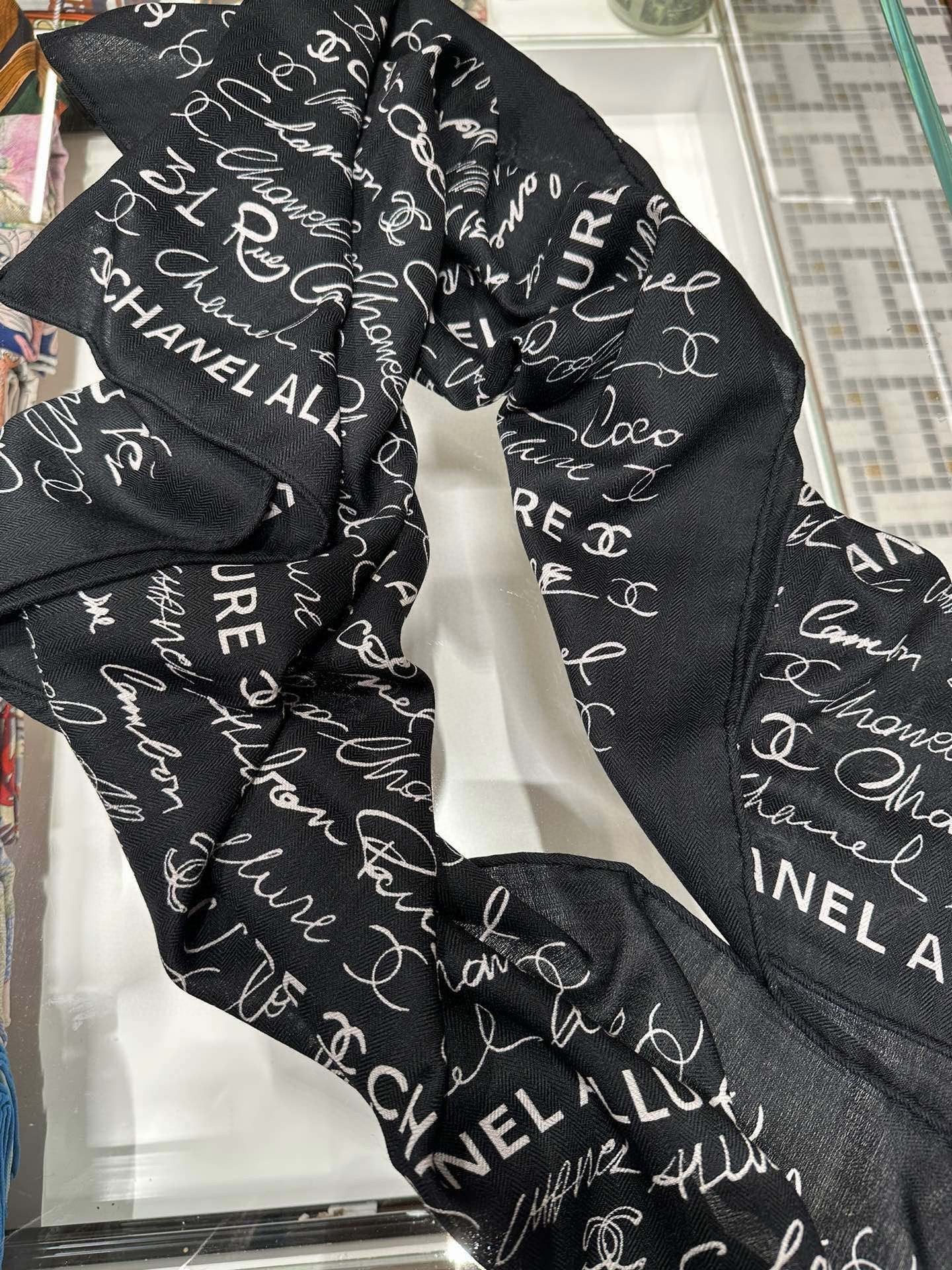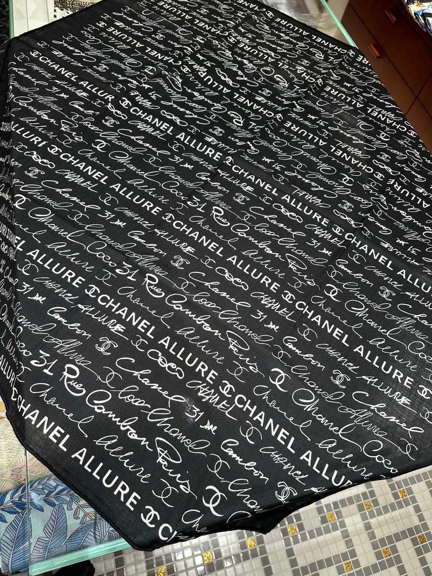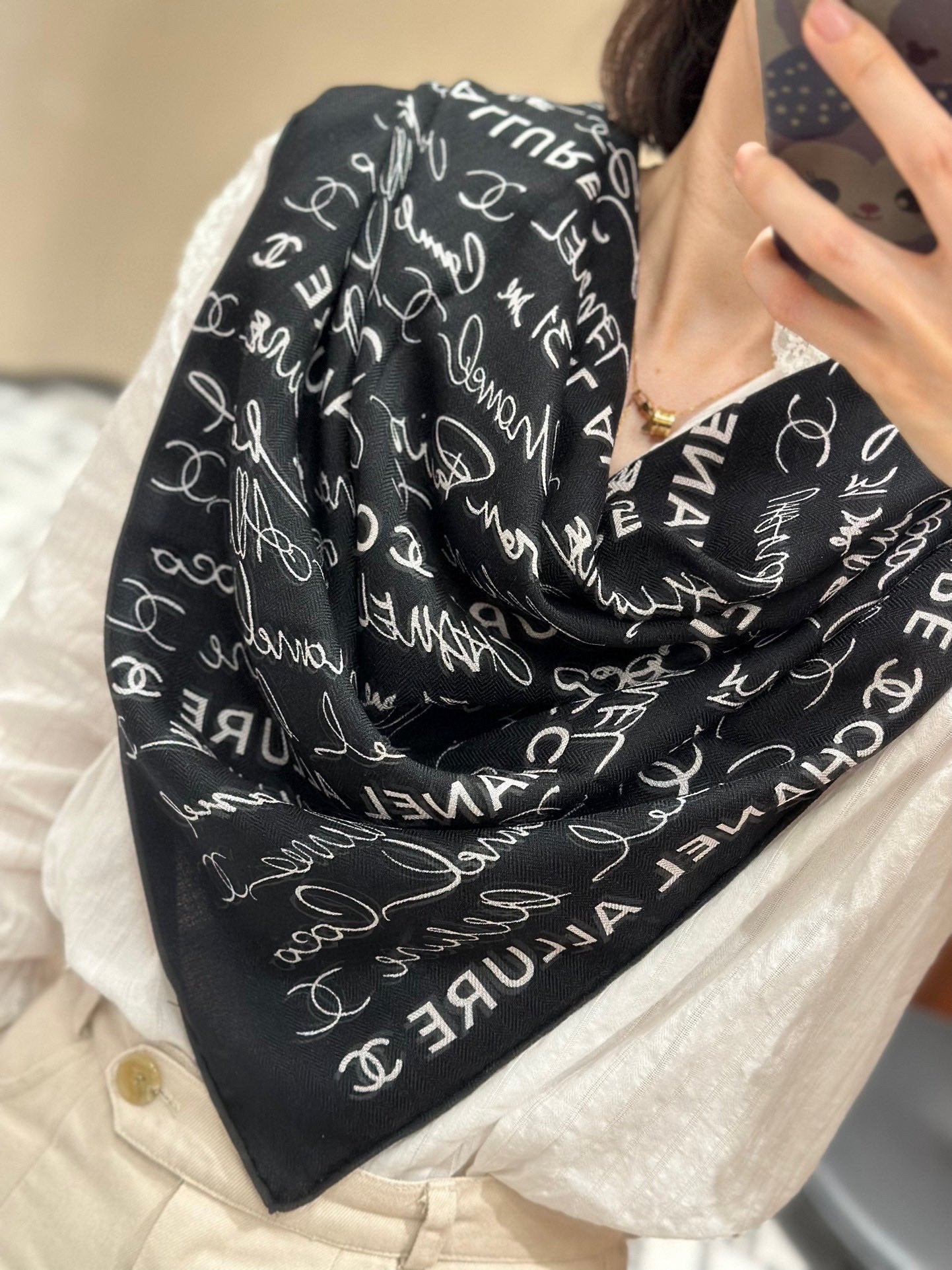 CC Square Scarf 110 CM In Black With White Text Cashmere Silk 320584
