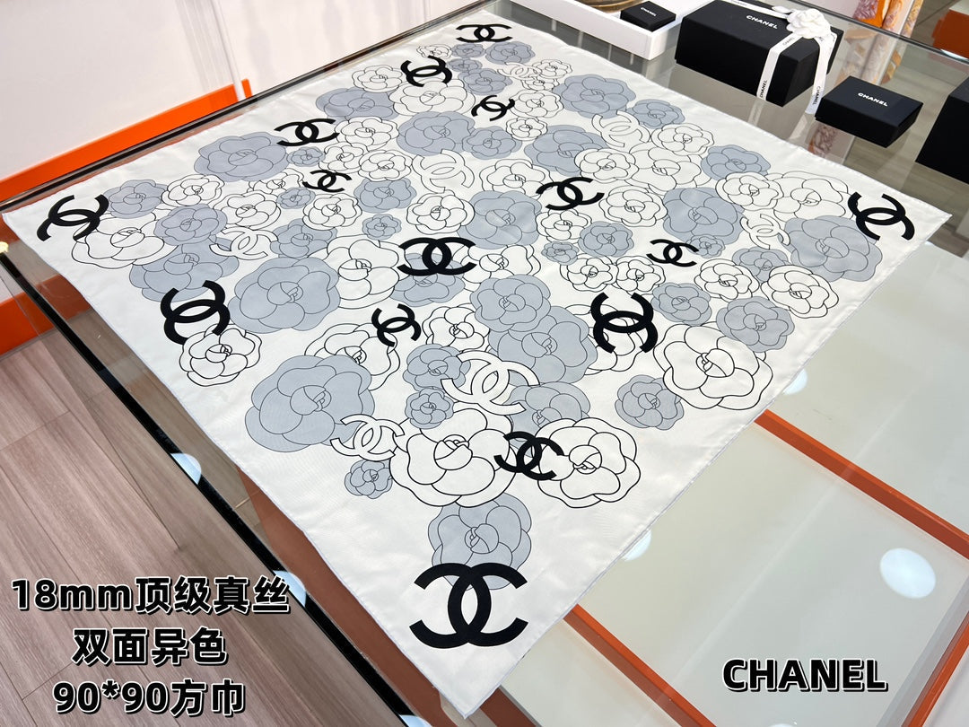 CC Square Scarf 90 CM In Grey Black And White Camellia Logo Print Silk Twill 288739