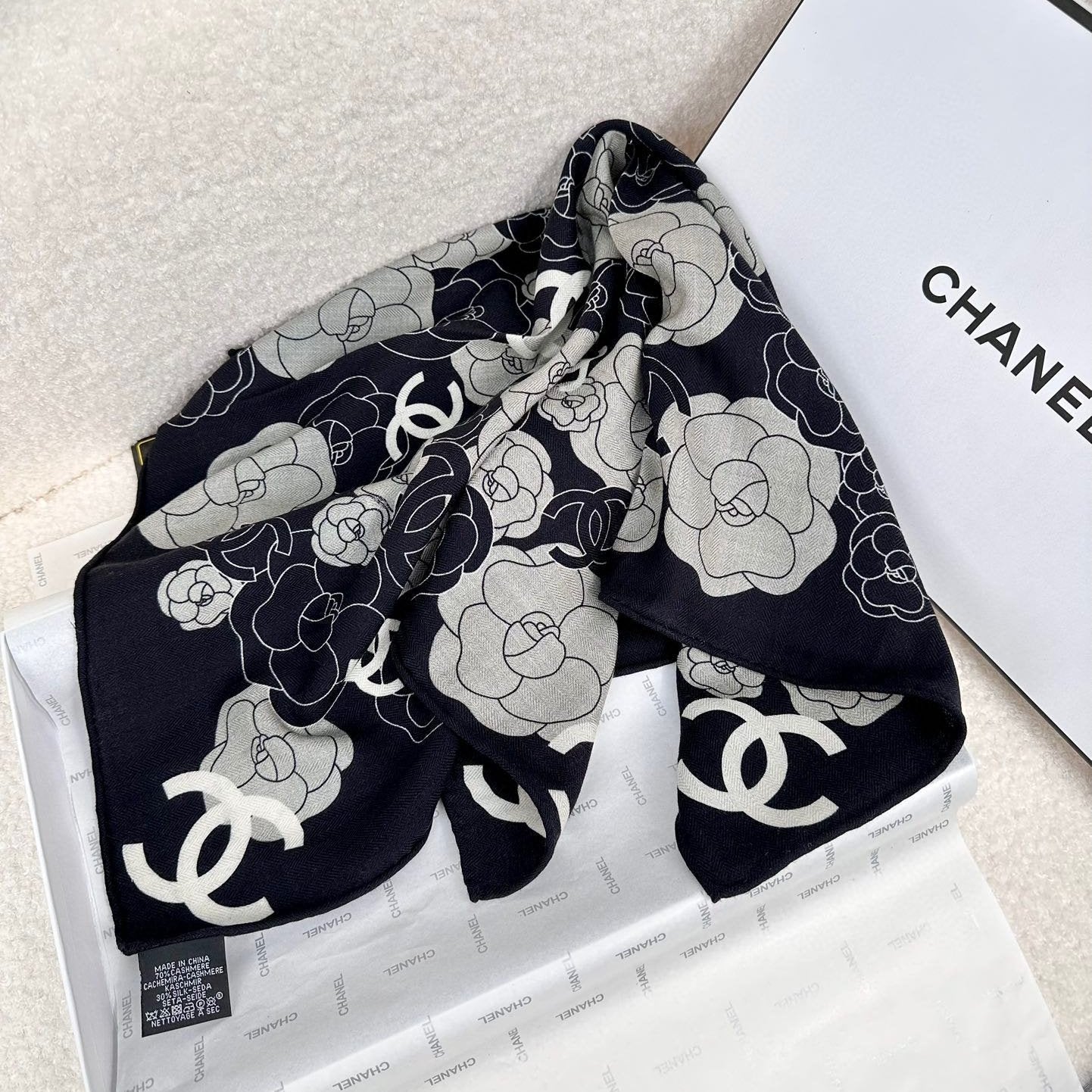 CC Square Scarf 70 CM In Black Mix Grey Camellia Cashmere And Silk 367380