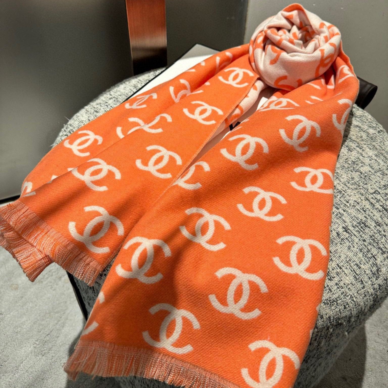 CC Scarf 180 CM In Orange Mix Beige Print Logo Wool And Cashmere 359269