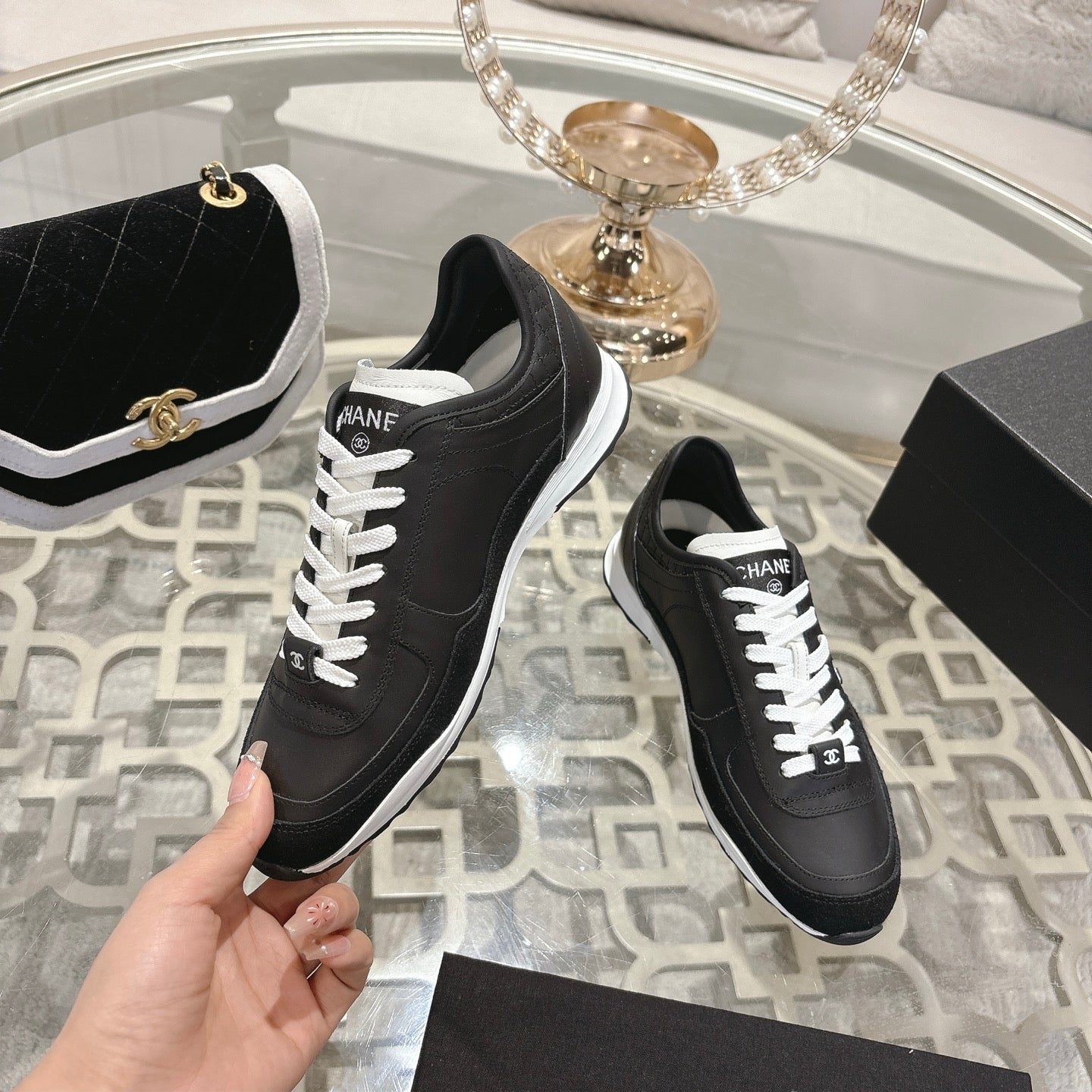 cc sneaker black white tweed black calfskin suede calfskin