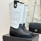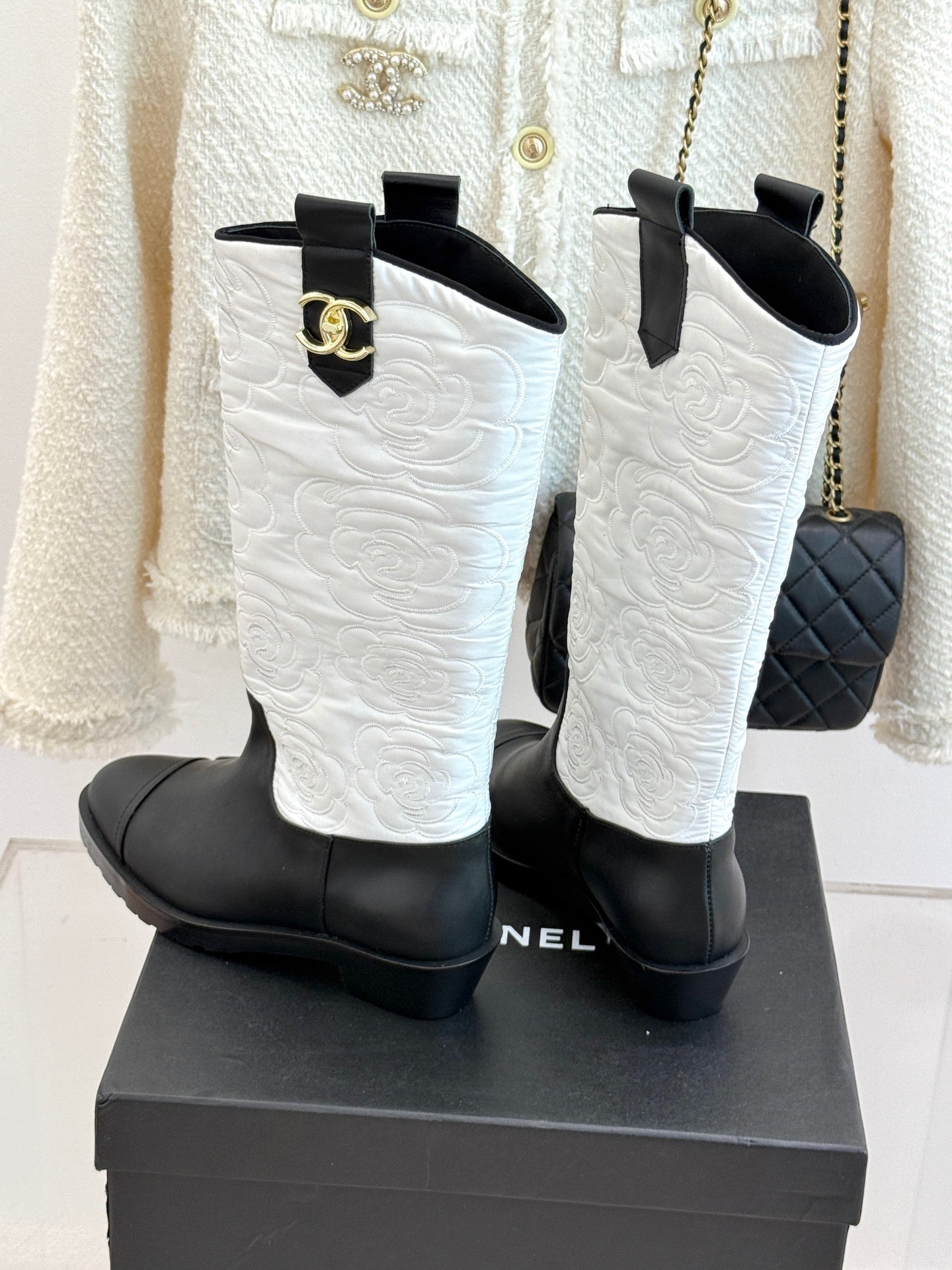 CC cowboy mid-calf boots black white sheepskin denim fabric 511981