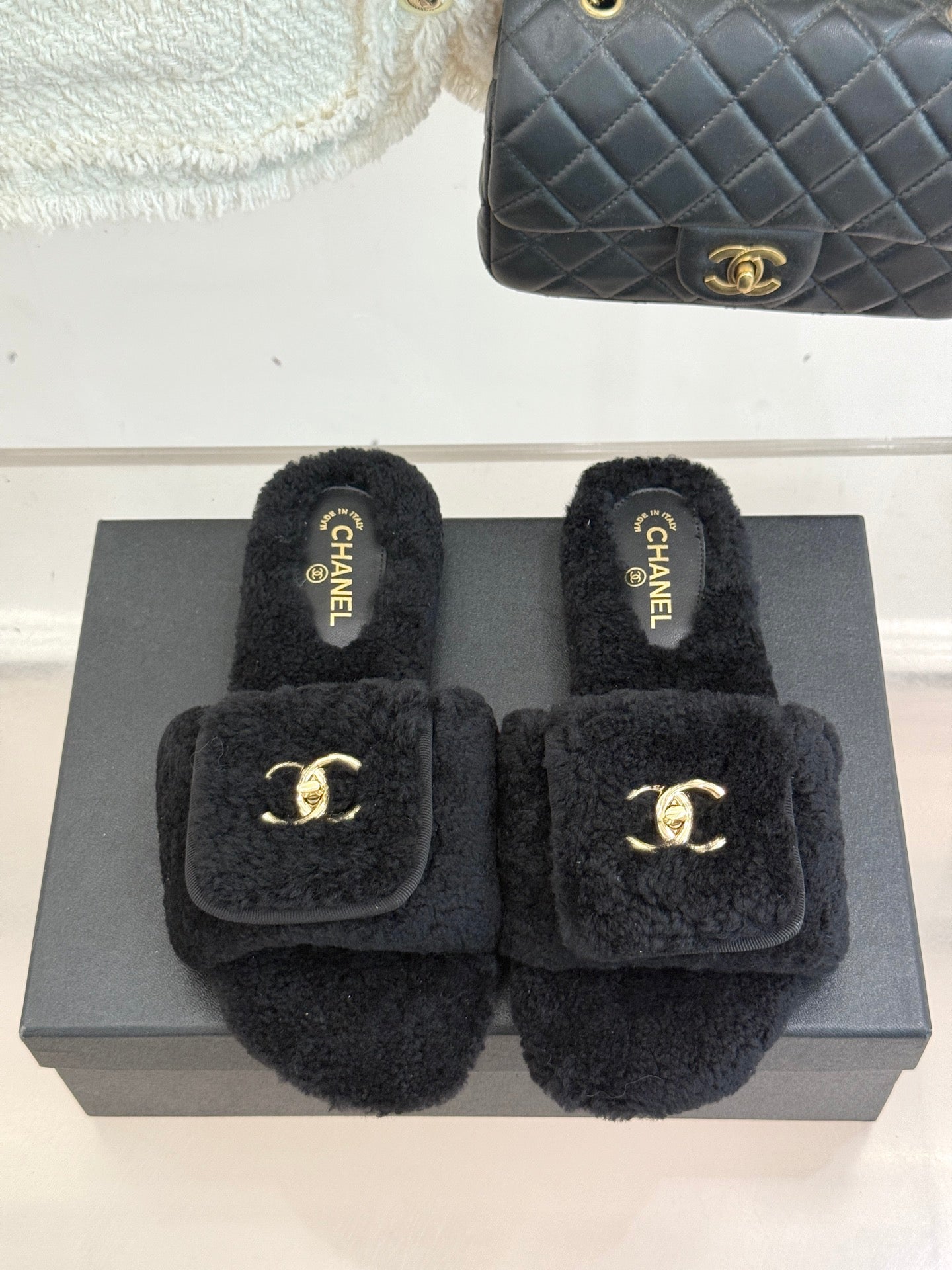 Chanel 25 Buckle Flip-up Thick-soled Slippers Black Wool 465380