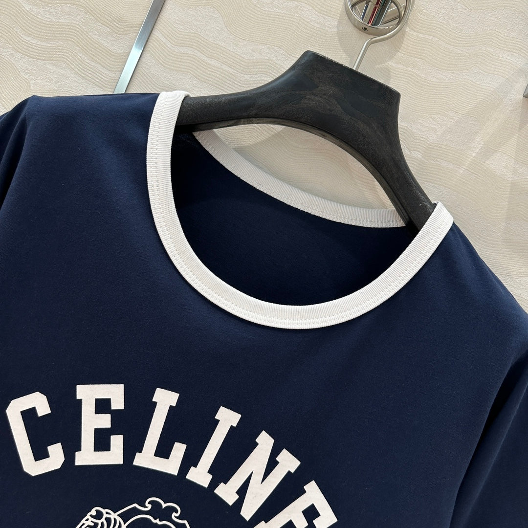 Celine 25 Arc de Triomphe Letter Short Sleeve T-shirt Navy Blue mix White Cotton
