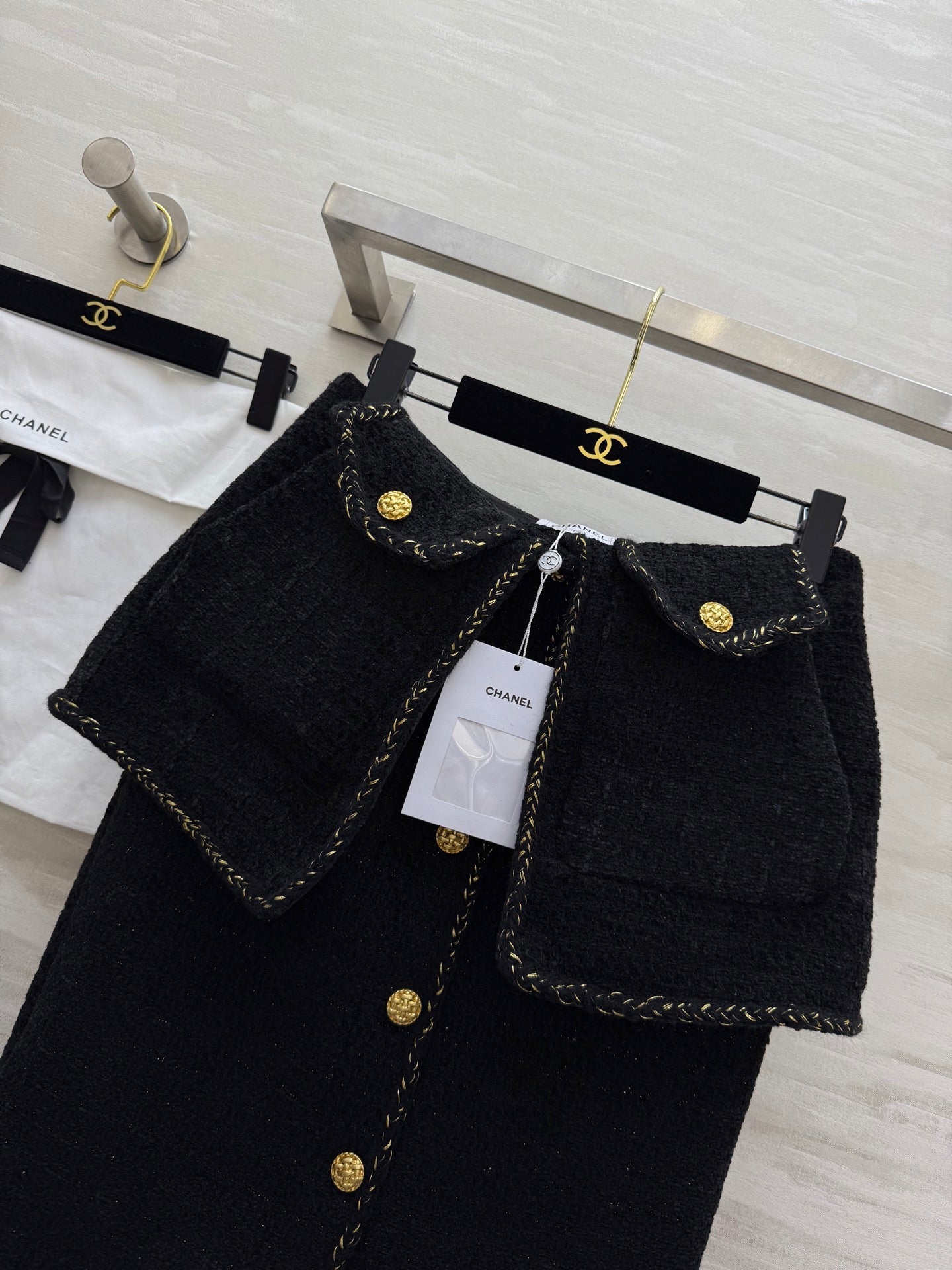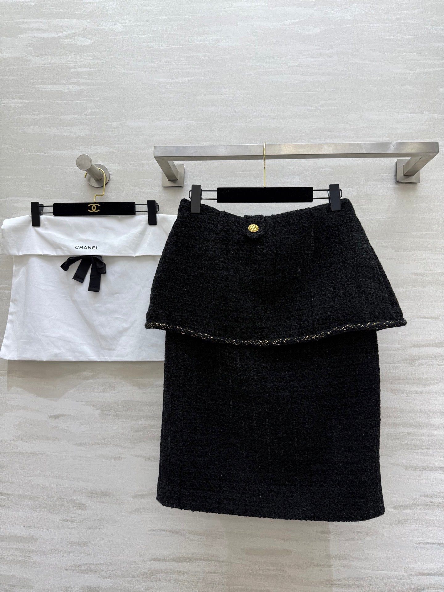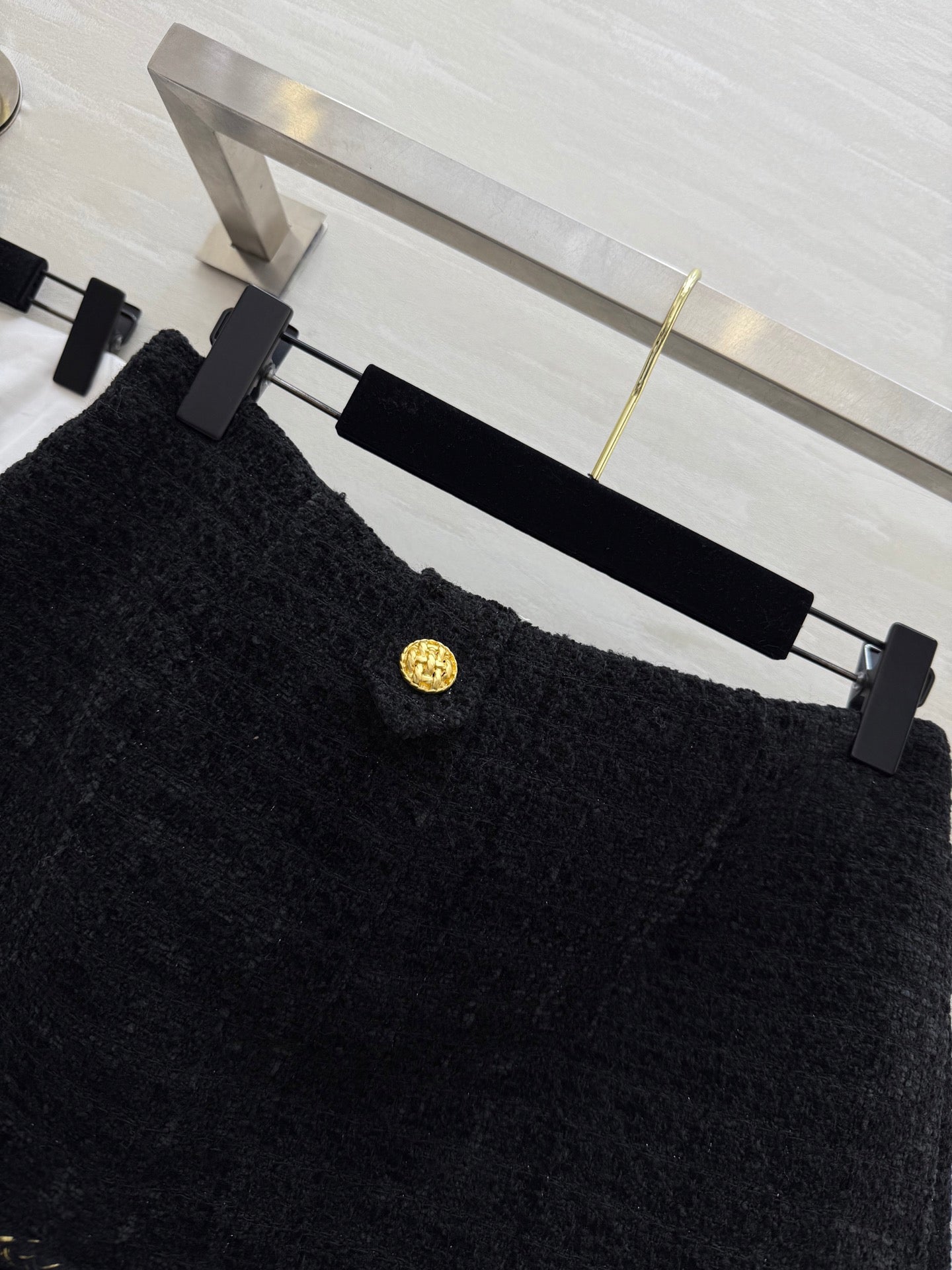 Chanel 2025 Gold Buckle Two-Piece Skirt Black Woven Tweed Fabric 319481