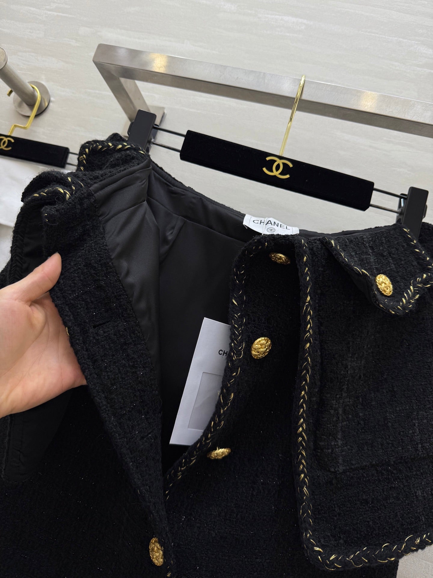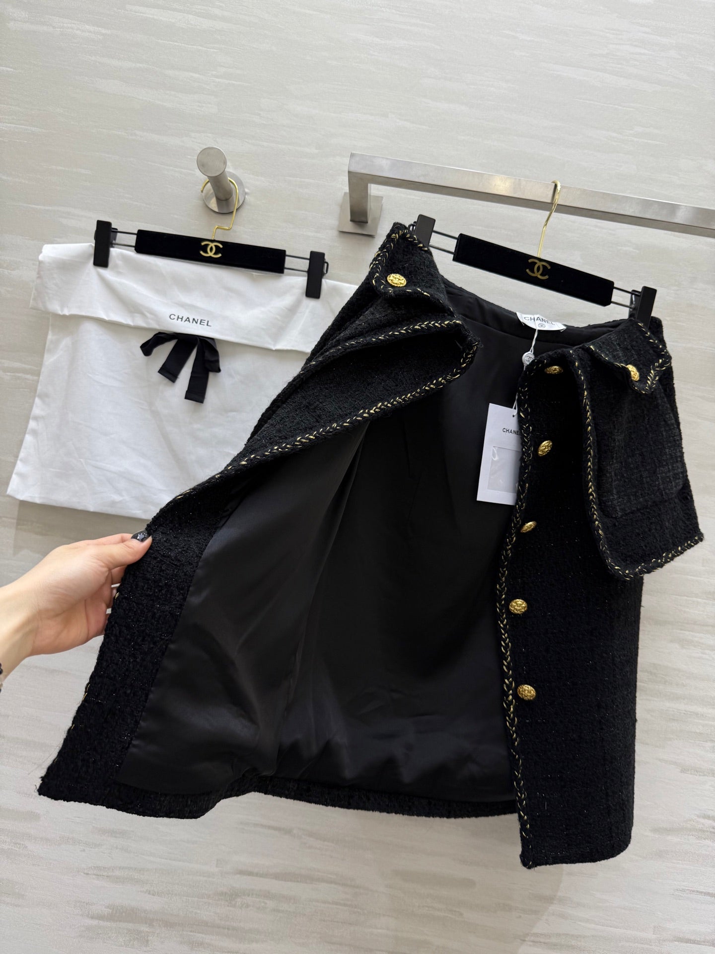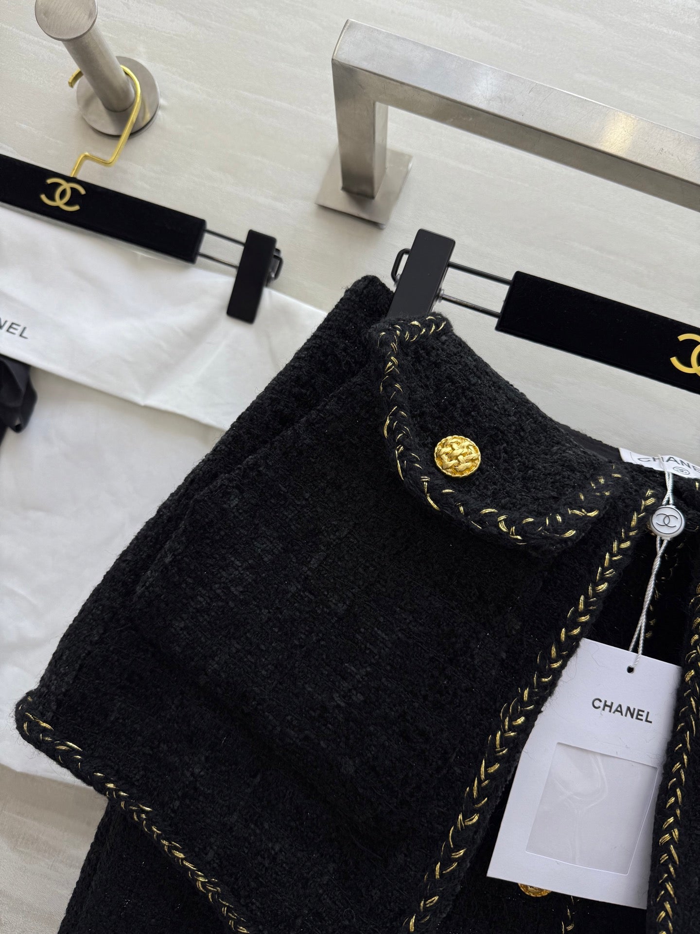 Chanel 2025 Gold Buckle Two-Piece Skirt Black Woven Tweed Fabric 319481