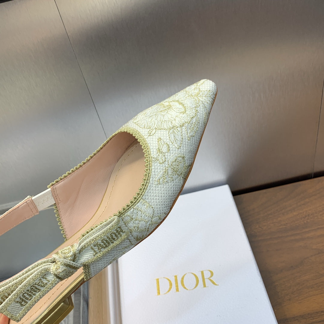 JAdior Slingback Flat White and Gold-Tone Toile de Jouy Mexico Embroidered Cotton with Metallic Thread