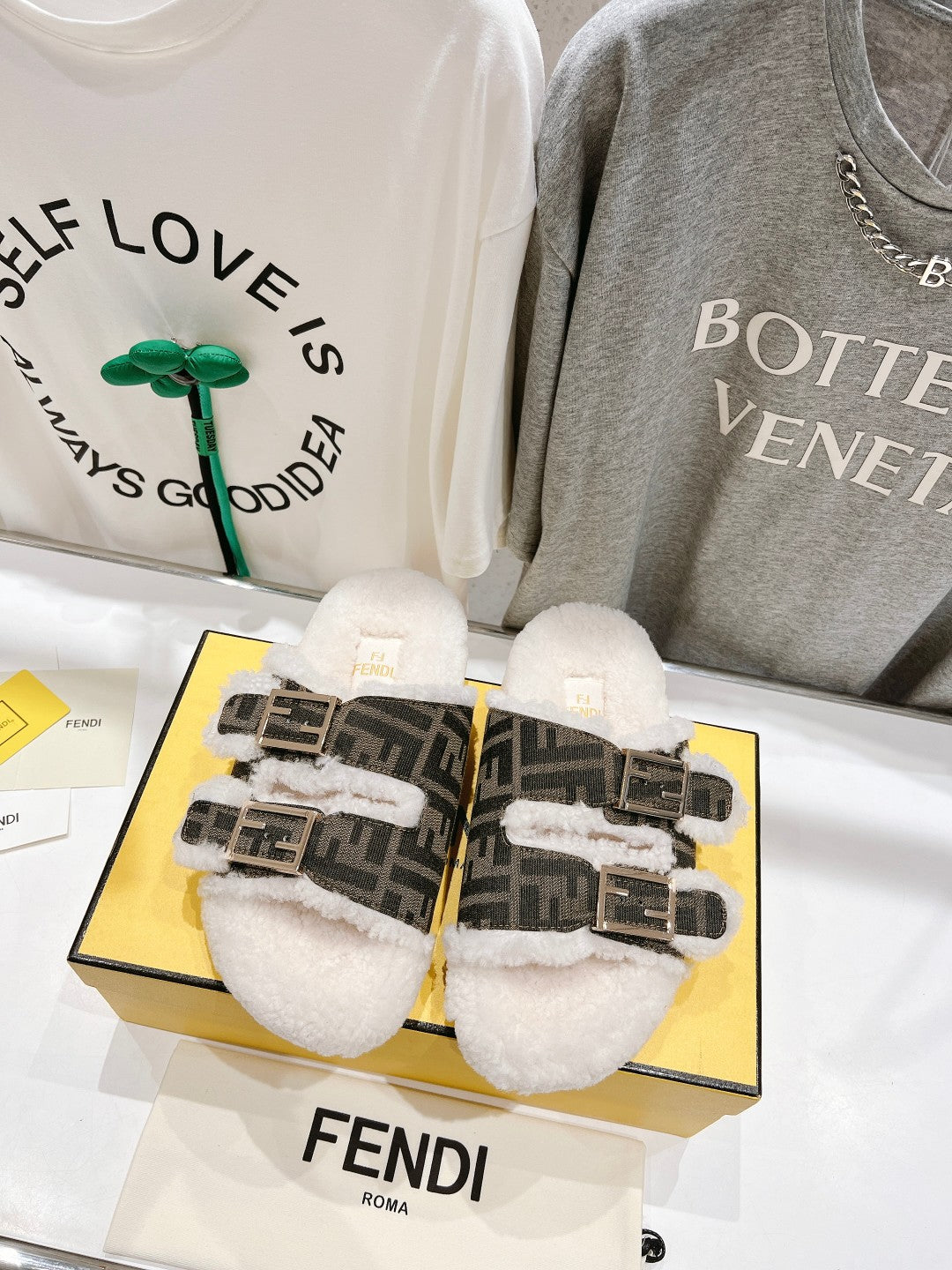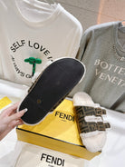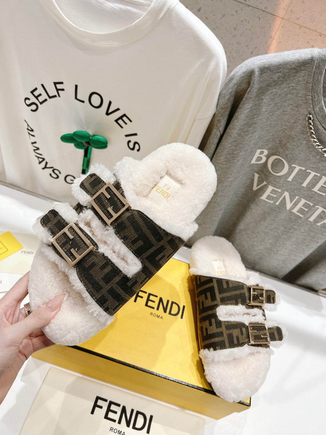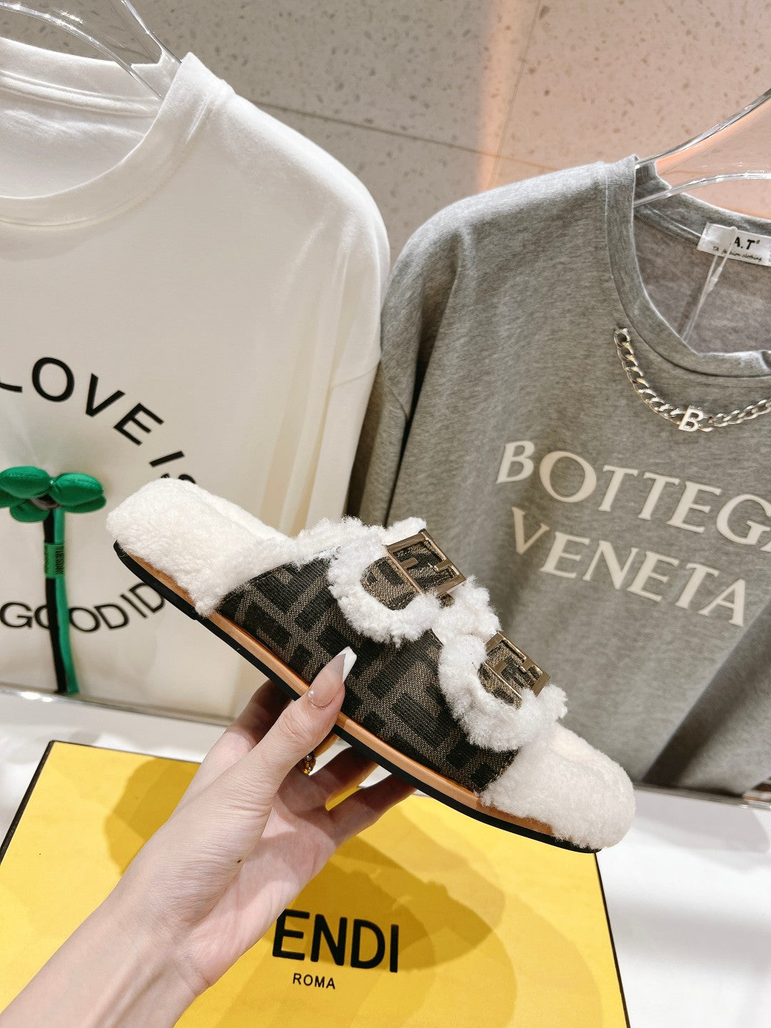 FENDI DAD SANDAL MULE IN BROWN MONOGRAM FF CANVAS WITH WHITE FLEECE