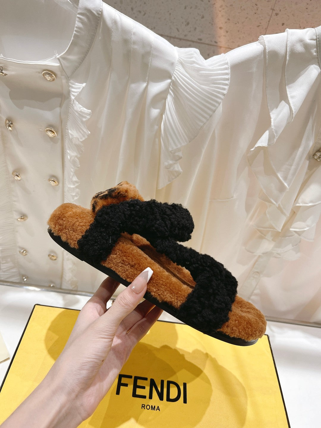 FENDI DAD SANDAL IN BLACK MIX CINNAMON BROWN FLEECE