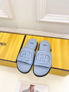 FENDI LOGO SLIDES IN BLUE POWDER CALFSKIN