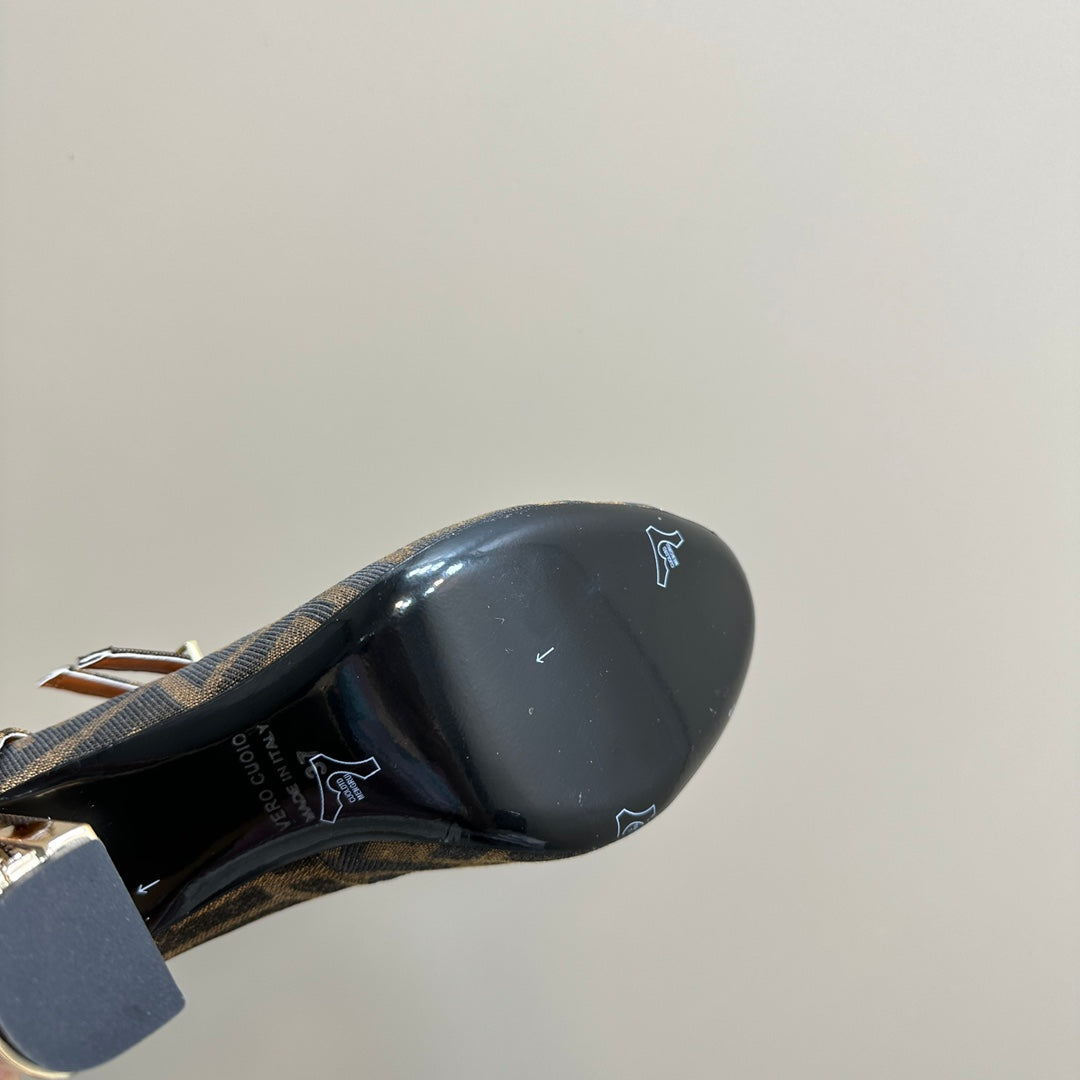 FENDI DELFINA HIGH-HEELED 85 MM SANDAL IN BROWN MONOGRAM FF CANVAS