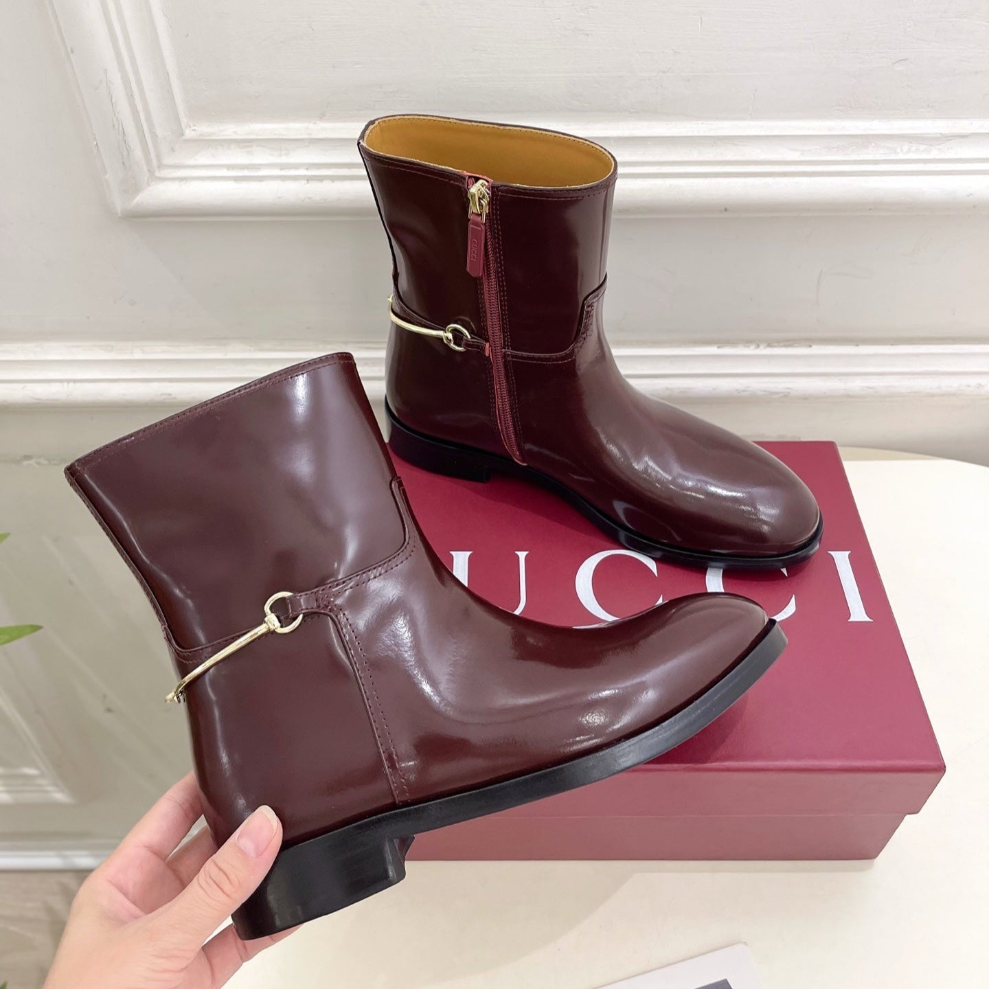 Gucci 25𝐬𝐬 horsebit ankle boots burgundy patent calfskin 435385