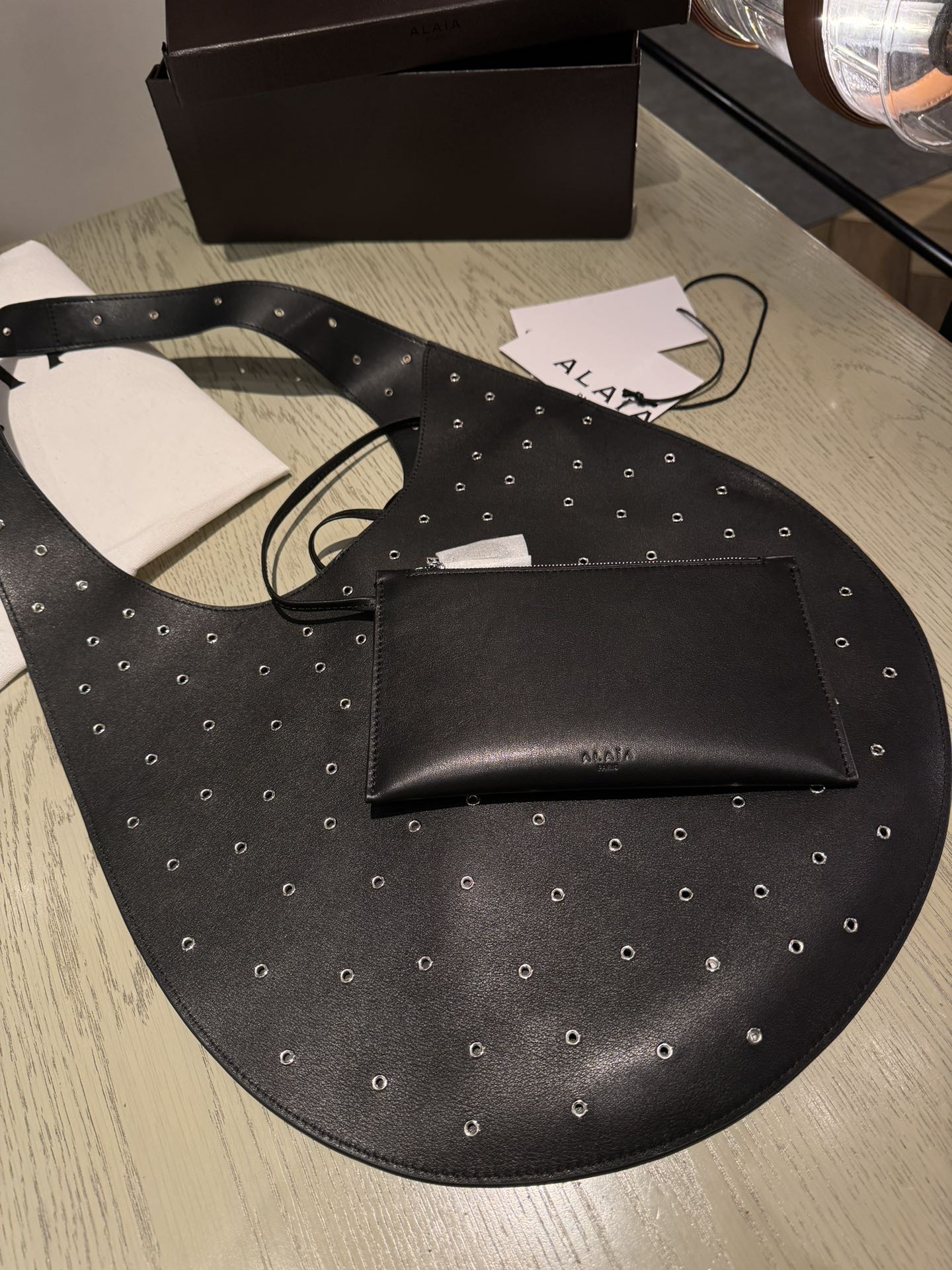 ALAIA Medium Hobo Flat Bag Metal Rivet Black Calfskin 243053