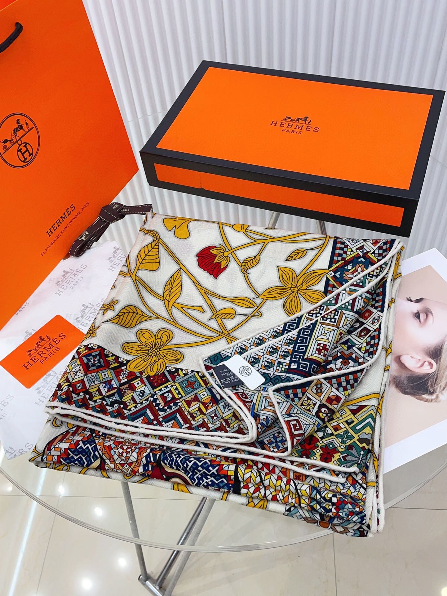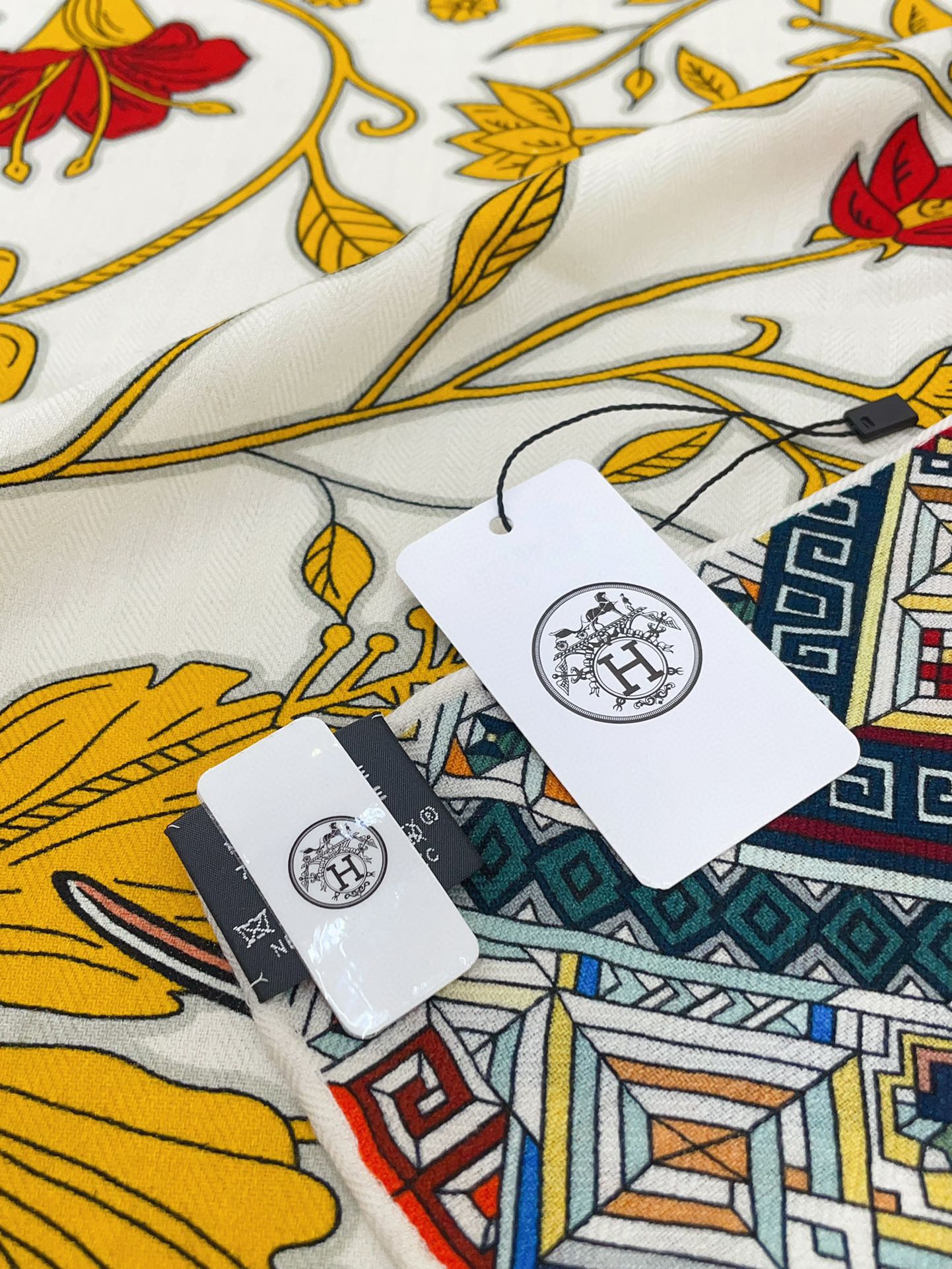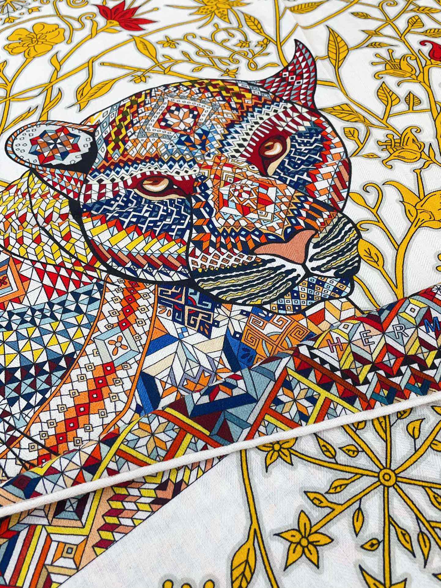 Le Jaguar Et Le Colibri Shawl 135 CM Yellow Colorful Cashmere And Silk 357903