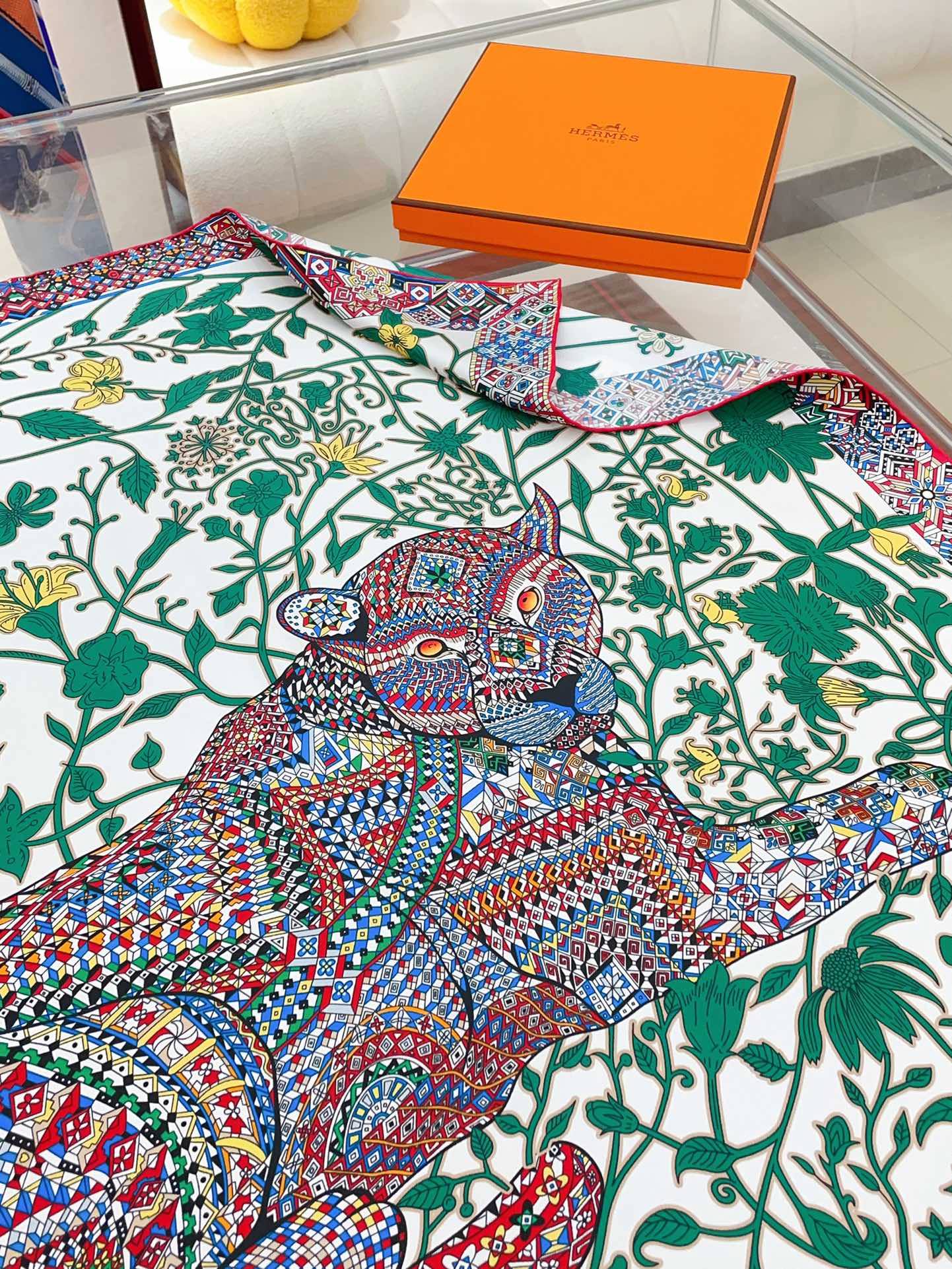 Le Jaguar Et Le Colibri Shawl 90 CM In Green Colorful Silk Twill 274208