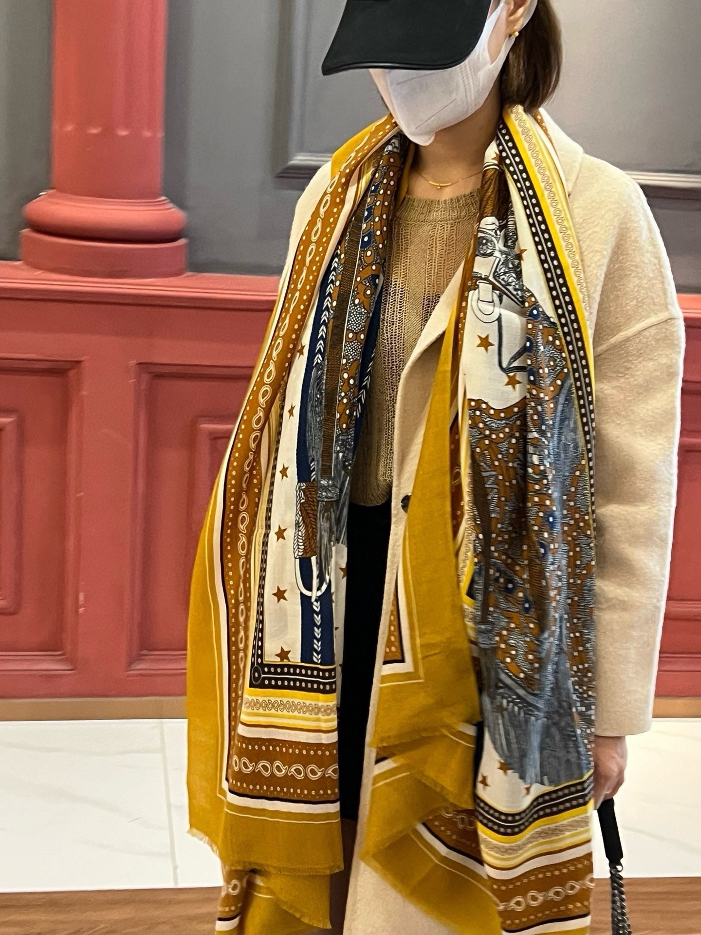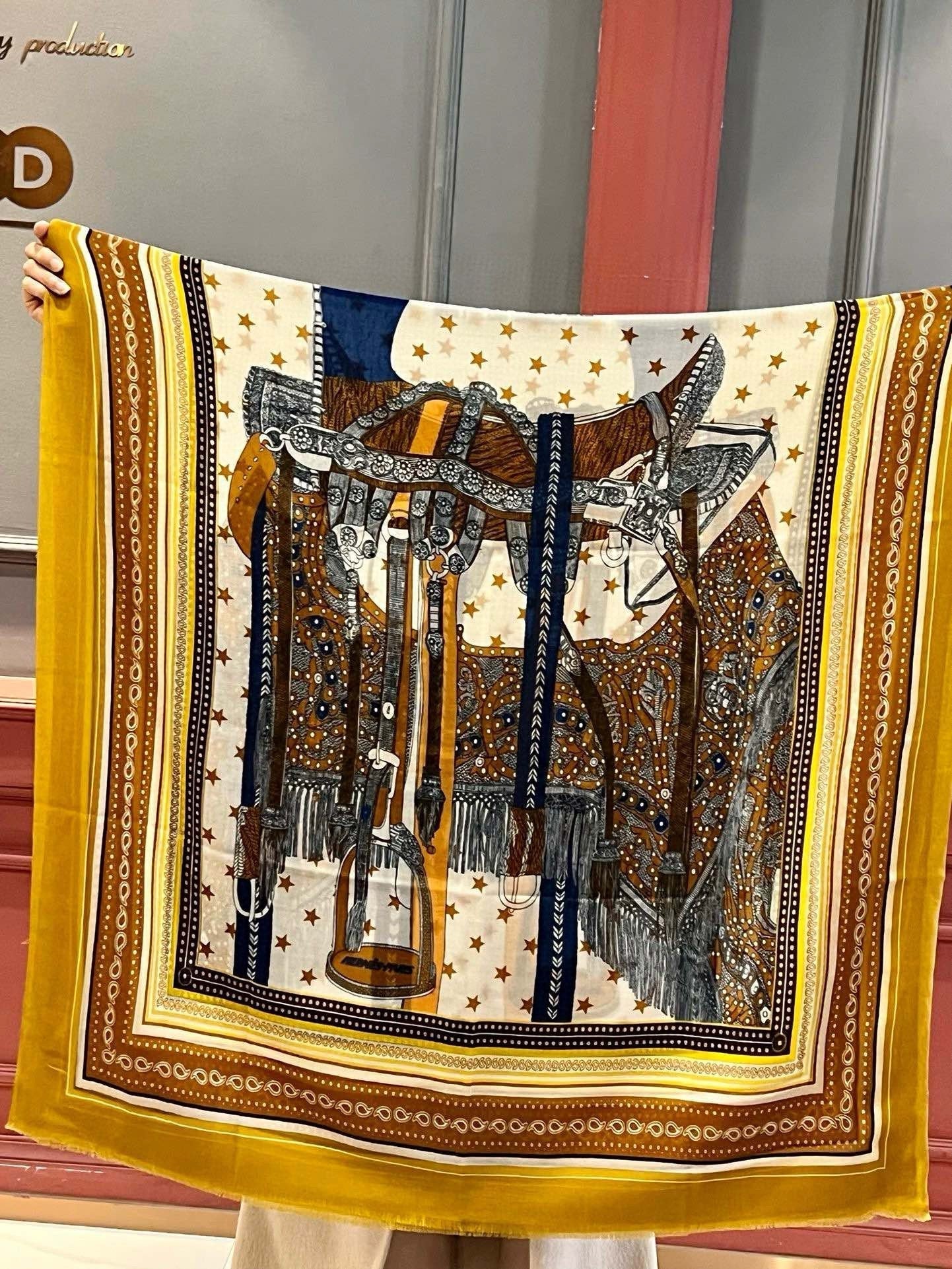 Selle De Dignitaire Bandana Shawl 200 CM In Yellow Brown Colorful Cashmere 265335