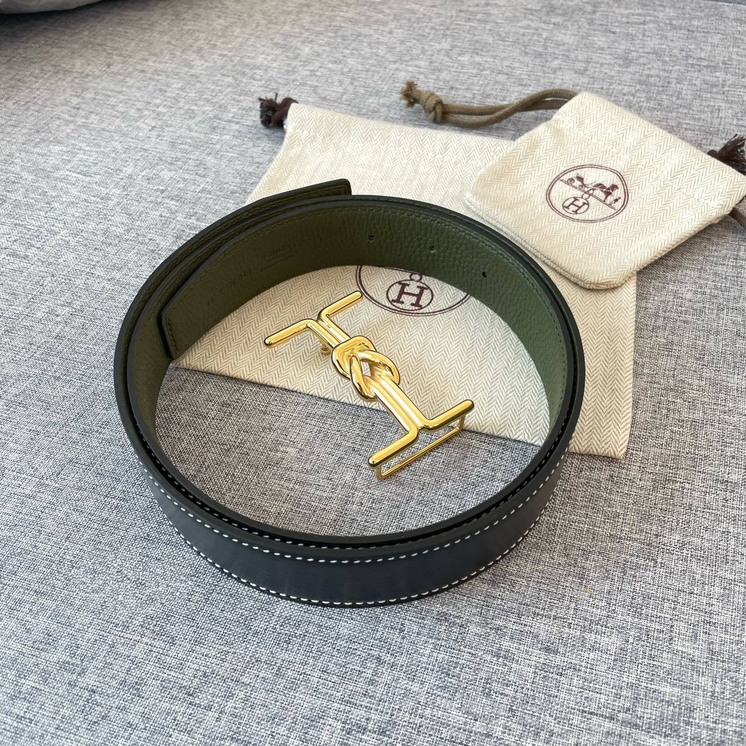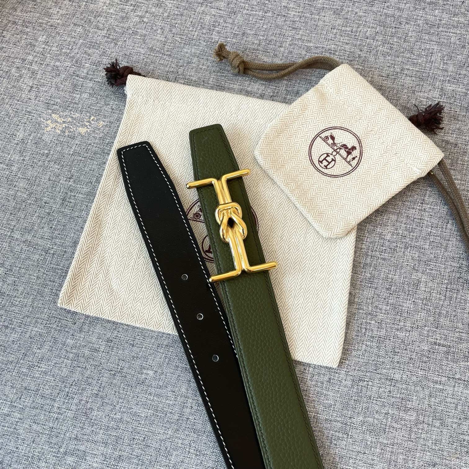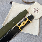 H MARIN REVERSIBLE BELT 32MM GOLD BUCKLE BLACK DARK GREEN LEATHER