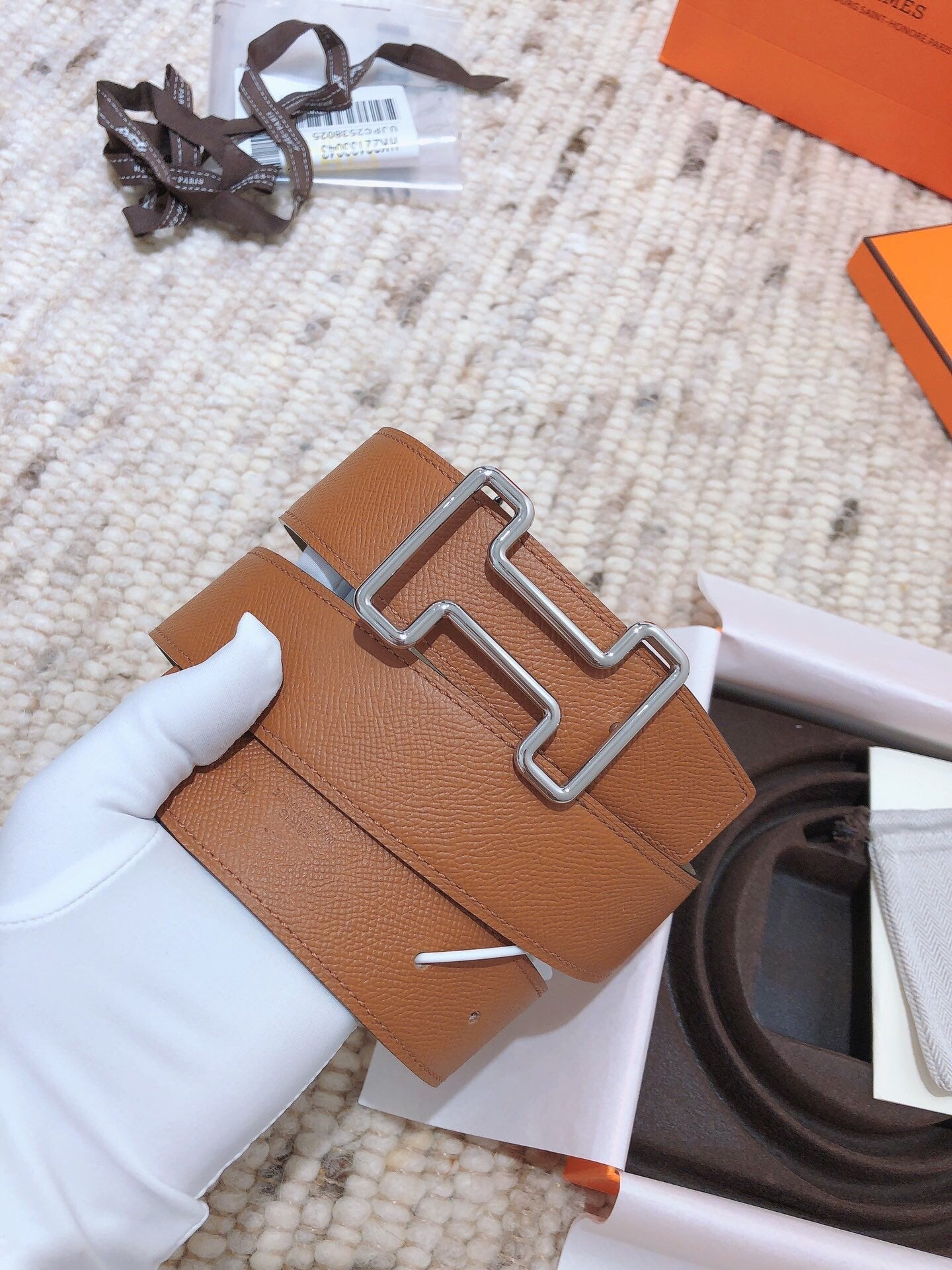 • H Buckle in permabrass plated metal.